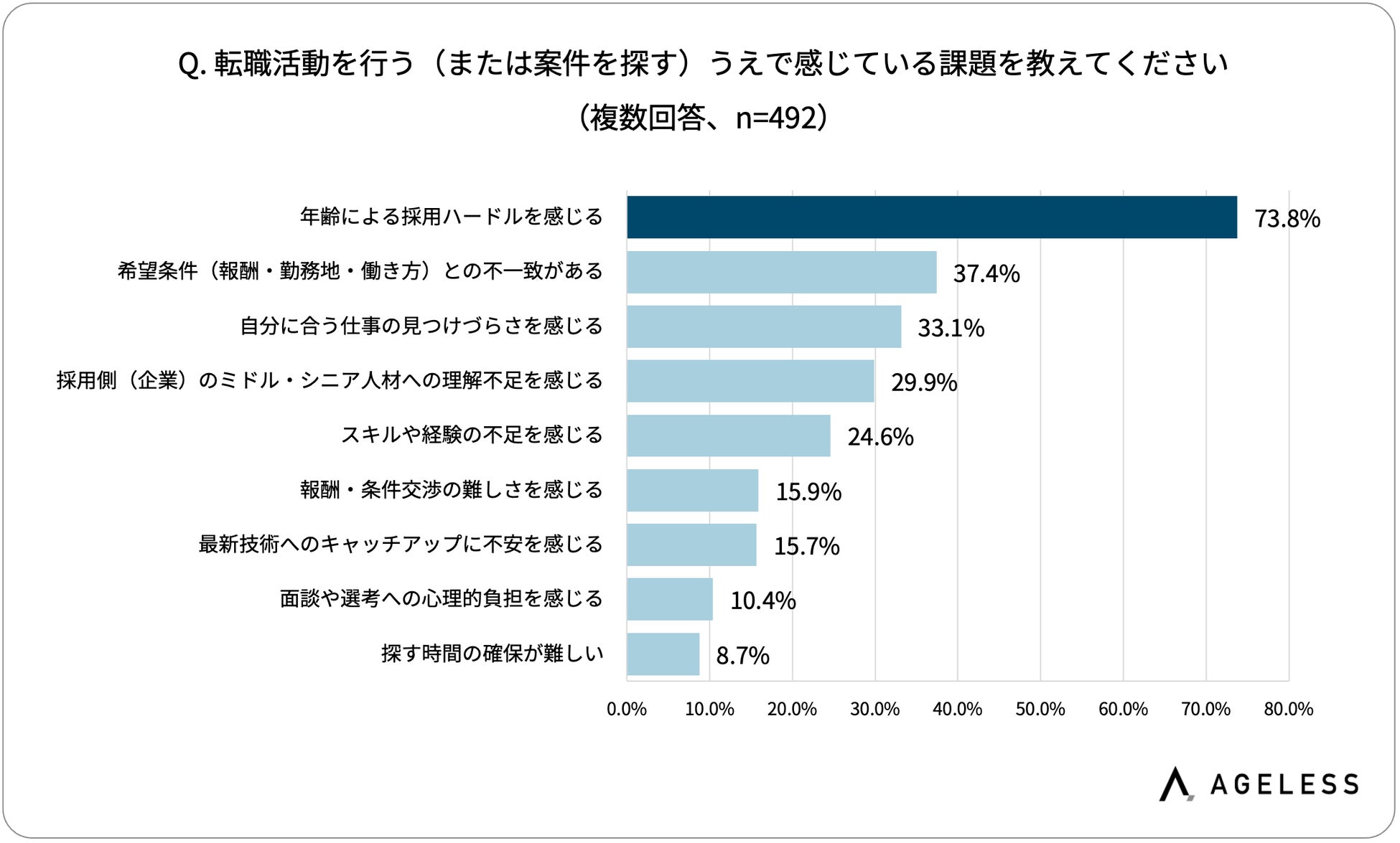 また、転職活動を行う(または案件を探す)うえで感じている課題についてたずねたところ、「年齢による採用ハードルを感じる」との回答が73.8%にのぼりました。就業希望者の数に対し、その受け皿を見つけづらいのが現状で、もどかしさを感じているミドル・シニア世代が多いことがうかがえます。