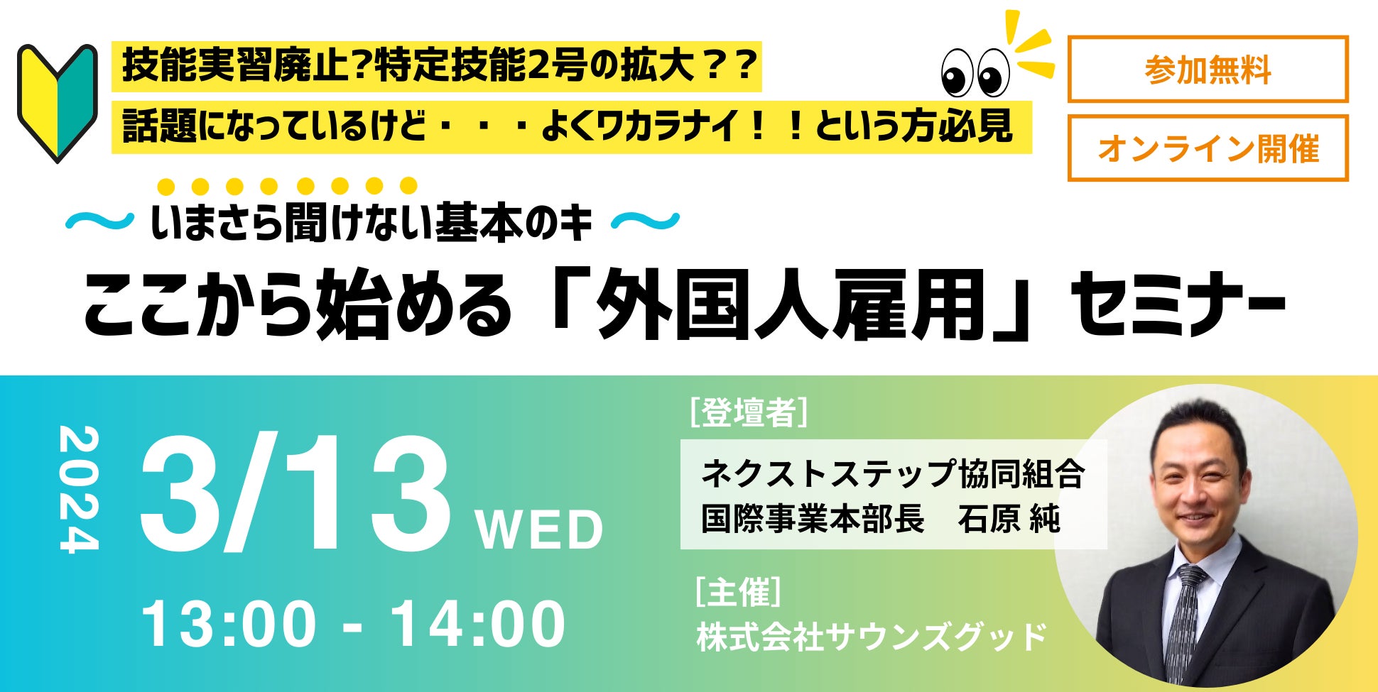 【企業担当者向け】外国人雇用の”いまさら聞けない”基本のキを知る!『ここから始める外国人雇用セミナー』 3月13日(水)開催(サウンズグッド)