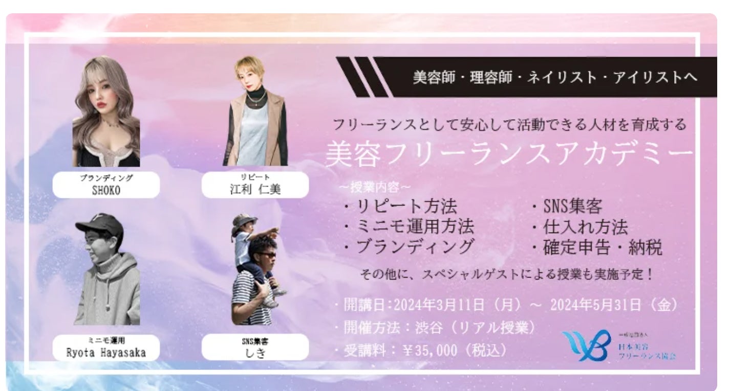 近年、働き方の多様化とともに、フリーランスとして働き始める方が増加しています。会計知識はフリーランスが事業を継続する上で非常に重要ですが、特に美容業界のフリーランスの方々は、フリーランスになる前やなった後も、会計について学ぶ機会がほとんどないという課題があります。加えて、実際に「確定申告でどこまでが経費になるのかが分からない」「まわりに会計について相談できる人がいない」といった美容フリーランス(美容師・理容師・アイリスト・ネイリスト)の方が抱える会計に関する苦労やお悩みの声も聞いています。フリーランスの方々が増加する中で、このような状況を社会問題と捉え、会計バンクは応援プロジェクトの一環として2024年3月11日に開校する「美容フリーランスアカデミー」を応援することとしました。