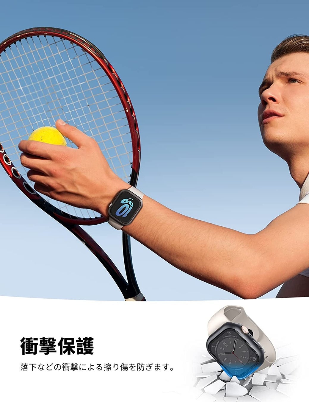 液晶部にはコーニング社のゴリラガラスを採用しました。ゴリラガラスは傷のつきにくい化学強化ガラスで、数々のスマートフォンやスマートウォッチで採用されています。バンパー部分に使われているのはアクリルの30倍、ガラスの200倍~250倍程度の強度を持つPC素材です。PC素材は強度を持ちながらも軽くて薄いのが特徴で、側面からの衝撃を防止。自動改札機にぶつけてしまっても、スポーツの際に何かに当ててしまっても、全方向の衝撃からしっかりApple Watchを守ります。