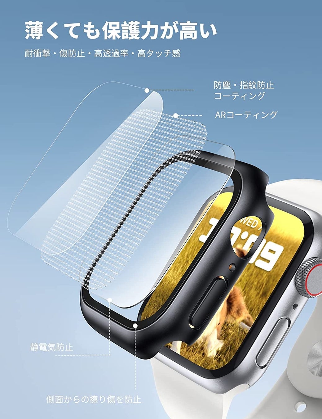 指紋防止コーティング、ARコーティング、静電気防止コーティングなど、さまざまなハードコーティング処理を施しました。特殊なコーティング技術により汚れが付きにくく、指紋や汗で画面が汚れるのを防ぐことが可能です。汗や化粧品などの汚れもを簡単に拭き取ることができますので、Apple Watch本来の美しさが損なわれず、画面本来のクオリティをそのまま表現できます。