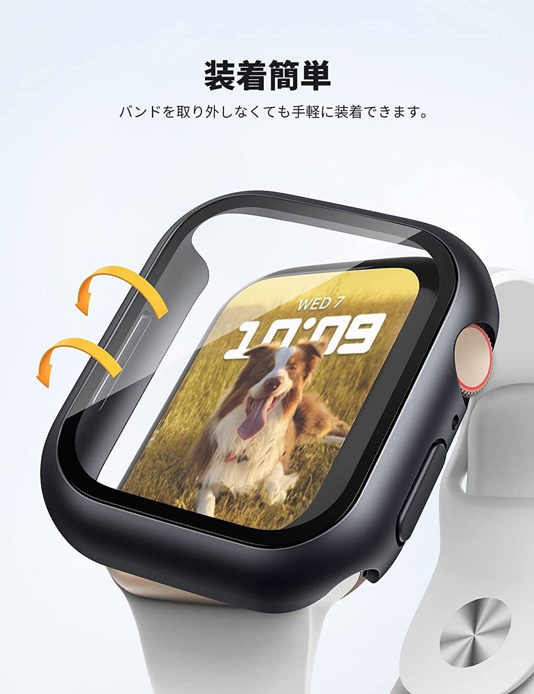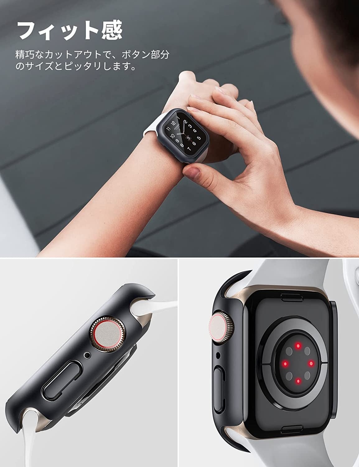 便利なセミオープン設計でボタン部分がカットアウトされているため、ケースを装着したままベルト交換ができます。腕にApple Watchをつけたままリューズ側からはめ込むだけで簡単に装着が可能です。また、ケースを装着したまま充電することもできます。