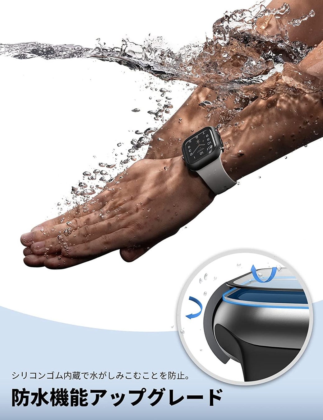 ケースはシリコンゴムで覆われており、画面内部への水の侵入を防ぎます。日常レベルの生活防水だけでなく、スポーツやウォーターアクティビティにも最適です。デザインに関しても、洗練されたミリ単位のカットアウトでスタイリッシュな見た目を実現しました。カラーは艶感のあるブラックで、独特の深みと共に大人の魅力を演出します。Apple Watch本来の魅力を引き立てつつ、存在感をプラスしてくれるため、仕事やプライベートなど使用場所を選びません。