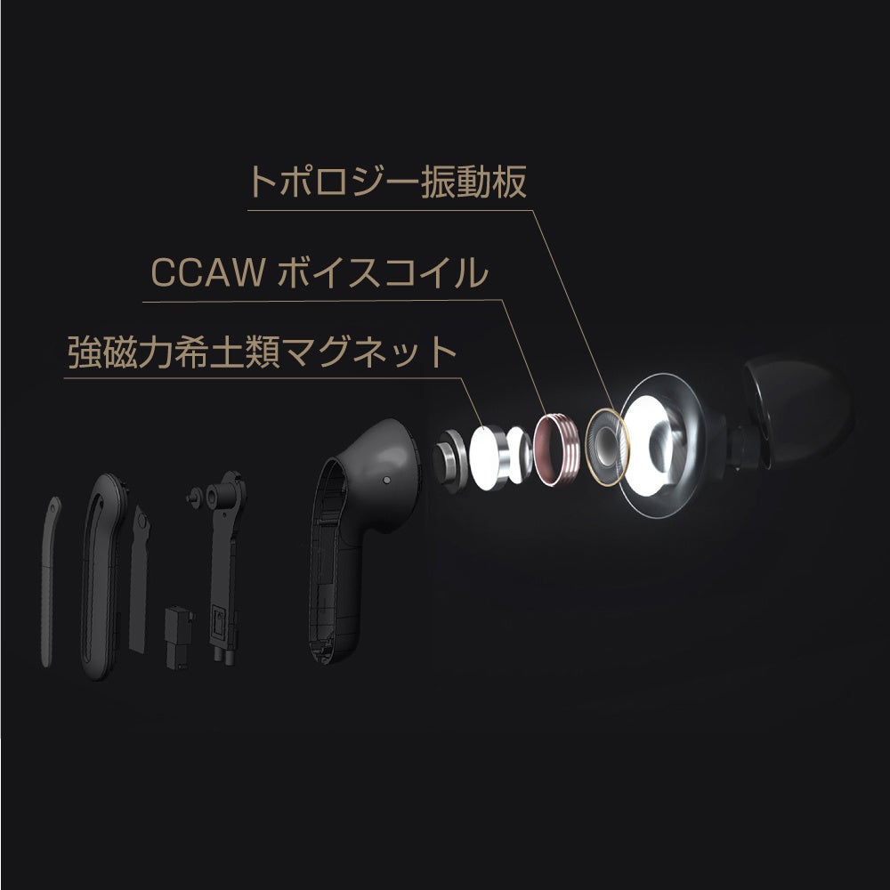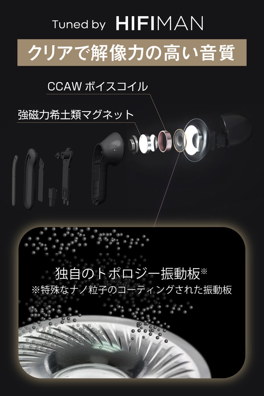 ・HIFIMANによる音質チューニング(Turned by HIFIMAN):HIFIMAN独自のトポロジー振動板を採用した大口径φ10㎜ドライバーを搭載。軽量のCCAWボイスコイルと強磁力希土類マグネットと合わせ、高音質再生を実現しています。