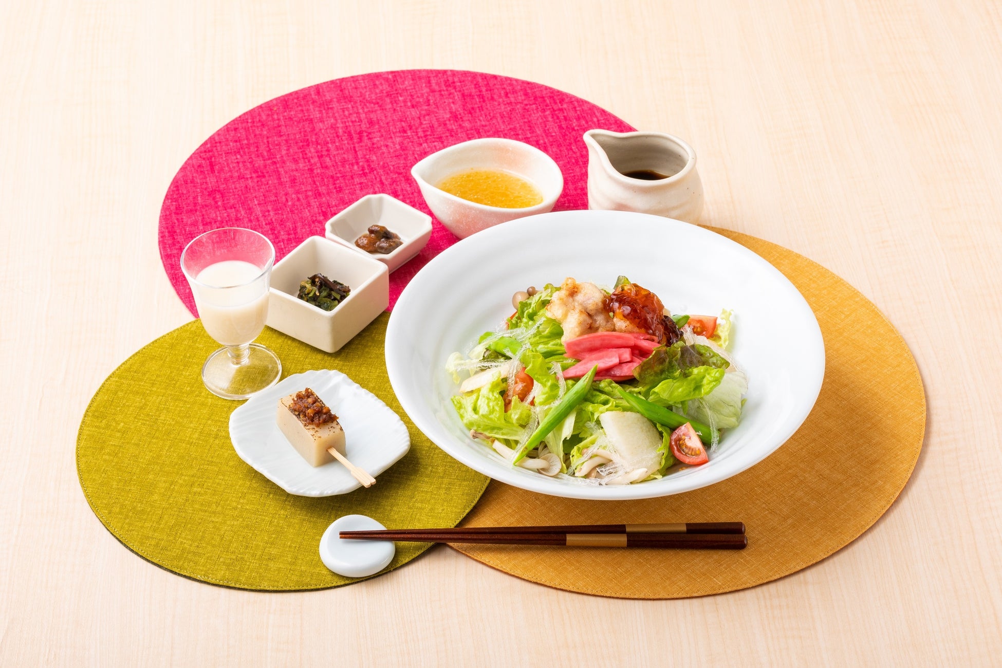 信州福味鶏の塩麹の天ぷら、信州伝統野菜(保平かぶの甘酢漬)と長野県産野菜を信州ゆずドレッシングでお楽しみいただけます。