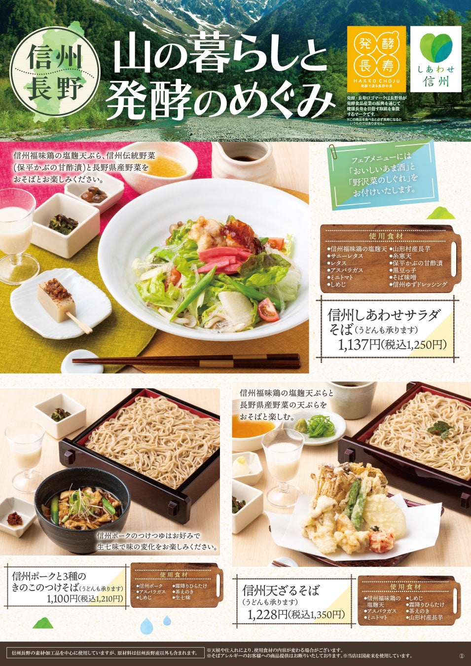 ~信州しあわせサラダそば・信州天ざる・信州ポークと3種のきのこのつけそば・信州山賊焼きセットなど信州の食材を味わえる商品を6月1日~7月31日の期間限定で販売。~