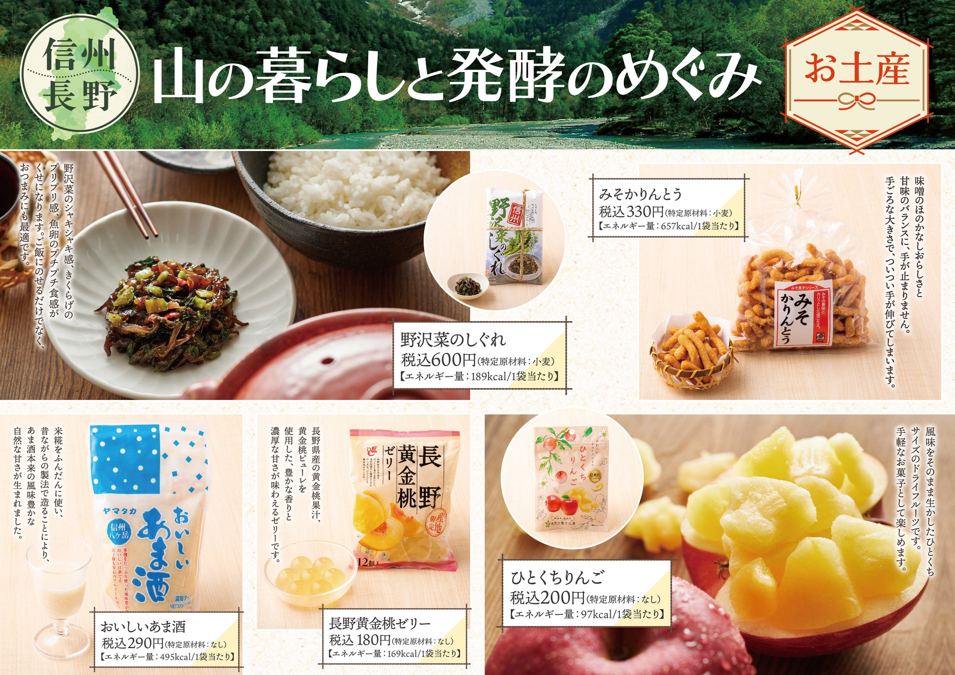 信州名物野沢菜漬けを使用しじっくりと風味豊かに炊き上げた「野沢菜のしぐれ」、みそと甘みのバランスが良い「みそかりんとう」、信州八ヶ岳の米糀をふんたんに使った「おいしいあま酒」、長野県産の黄金桃ピューレを使用した「長野黄金桃ゼリー」、長野県産ふじりんごを使用した甘酢っぱい味わいの「ひとくちりんご」の5種類のお土産をご自宅でもお楽しみいただけるように取り揃えております。