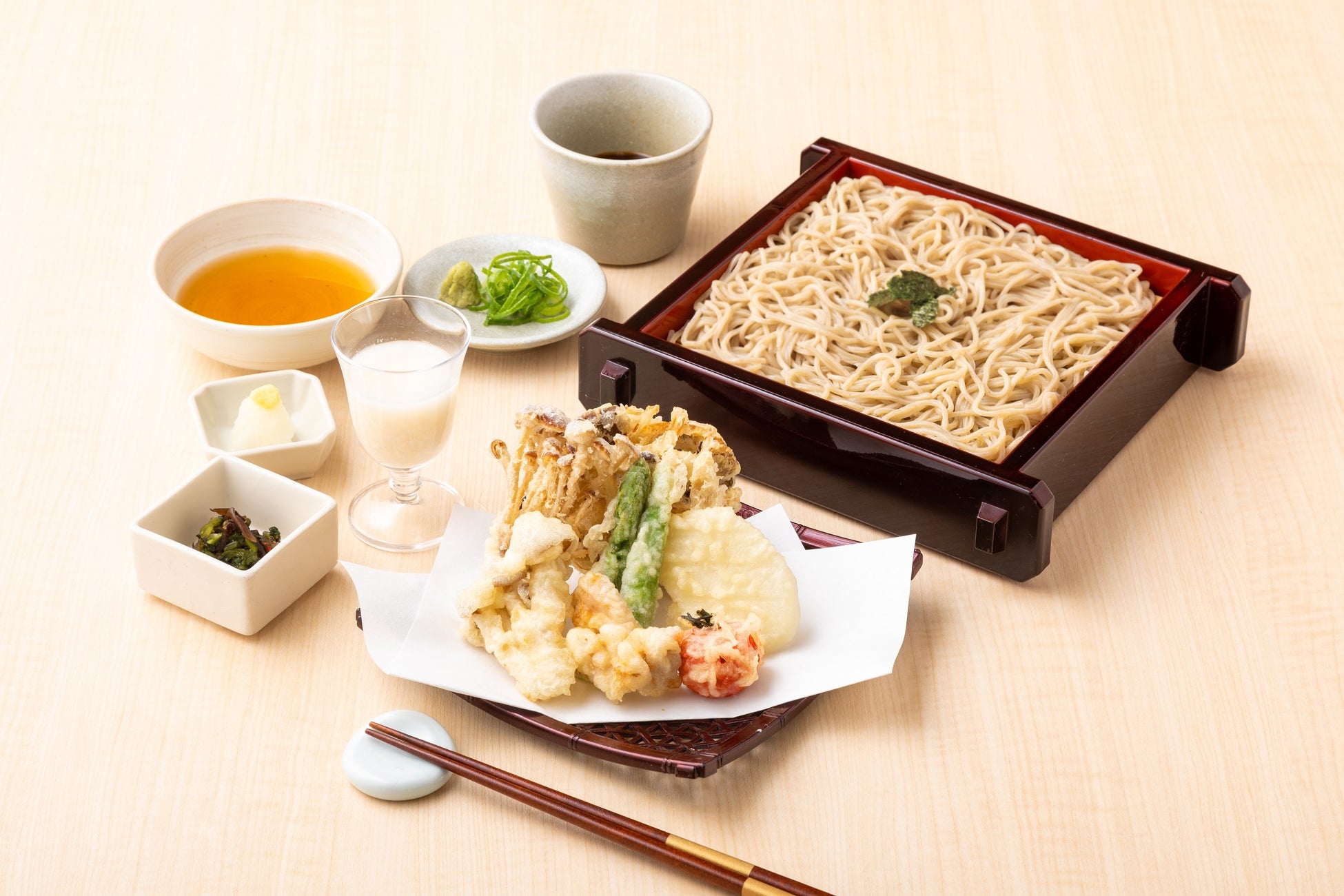7種の素材、信州福味鶏の塩麹天ぷら・しめじ・霜降りひらたけ・アスパラガス・茶えのき・ミニトマト・山形村産長芋の天ぷらとおそばをお楽しみ下さい。