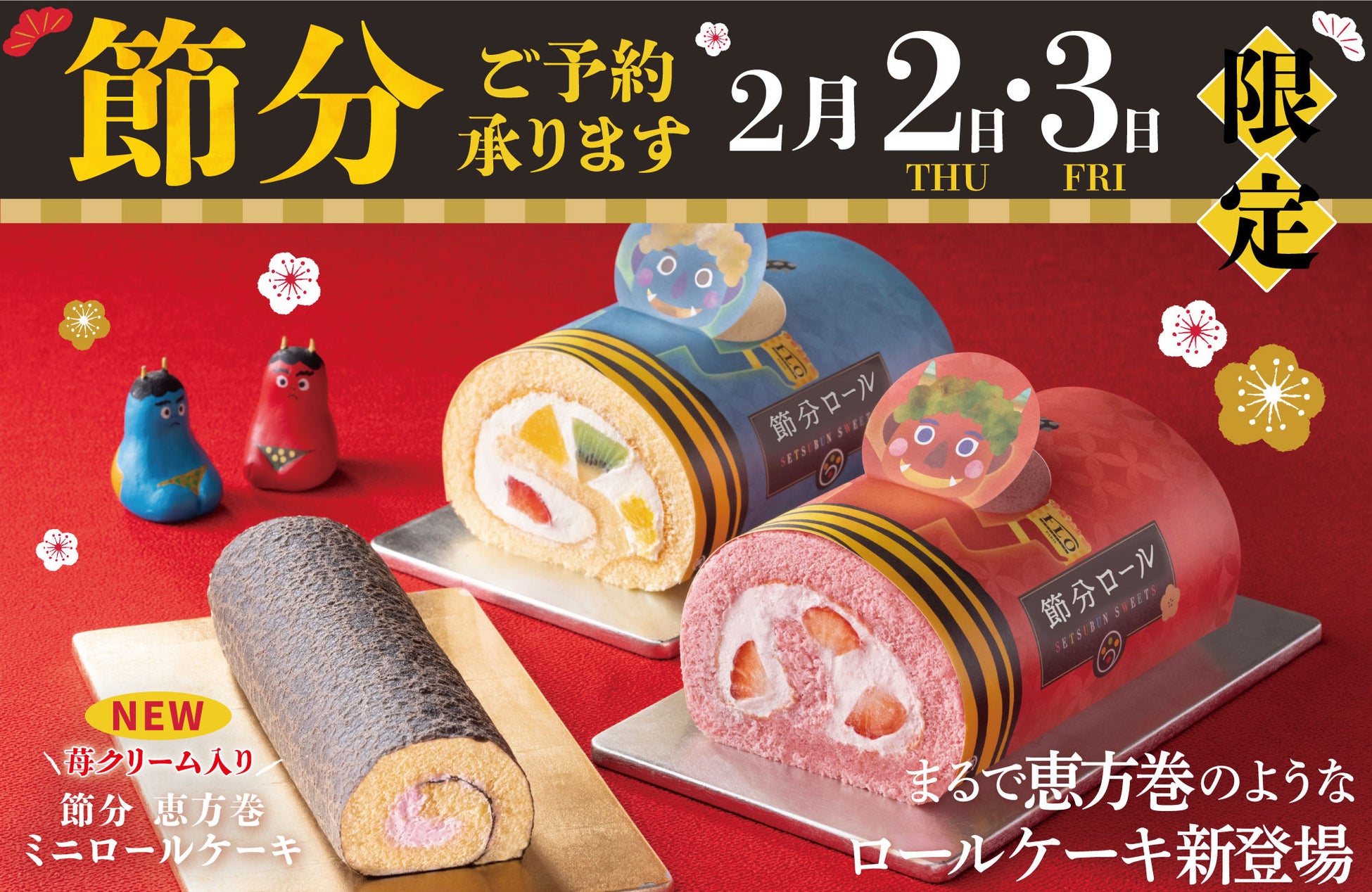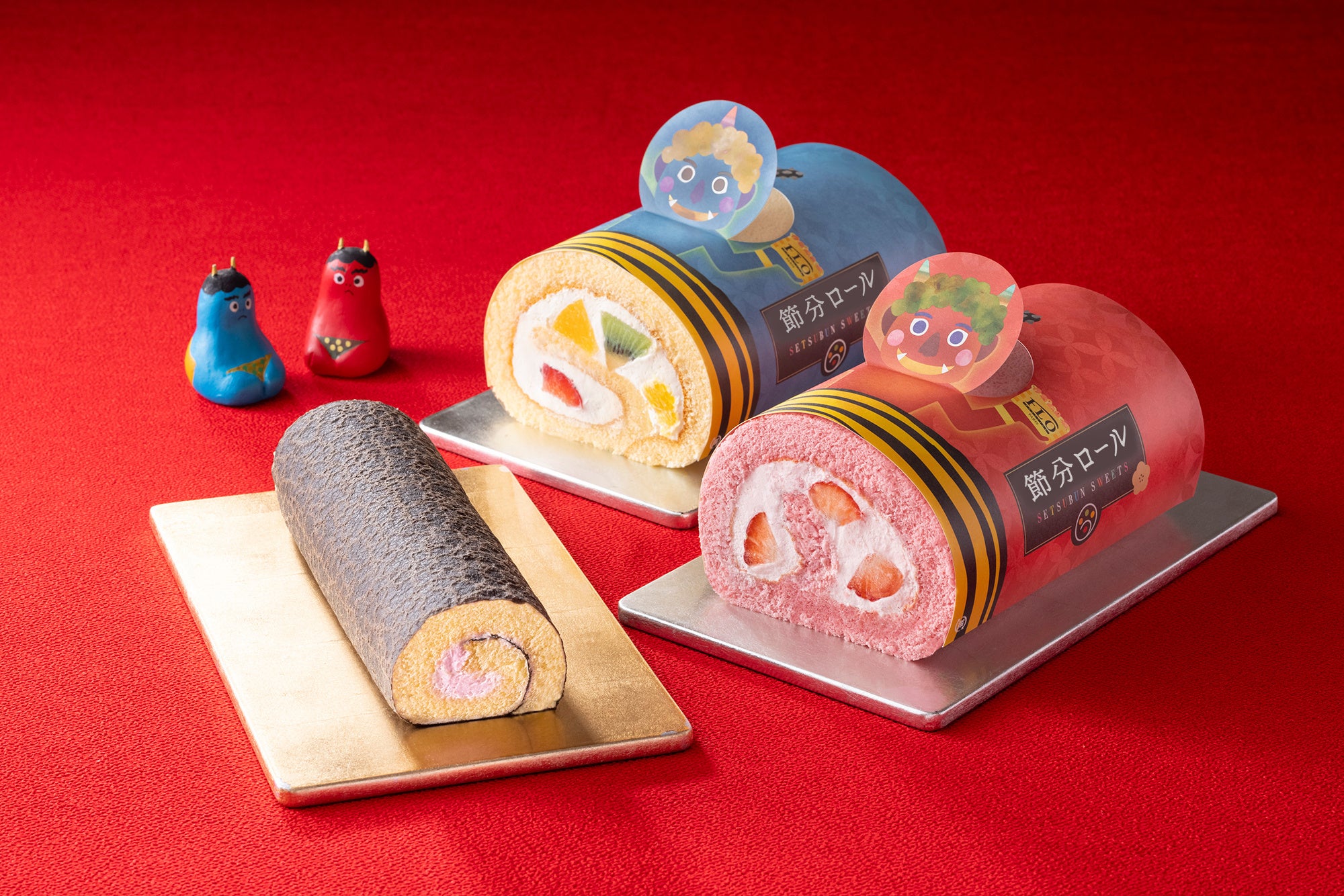 ふんわり軽いスポンジ生地で旬の苺やフルーツを巻き上げ、ご家族でお楽しみいただける紅白2色の「節分ロールケーキ」や、2023年新登場・お求めやすく、ブラックココアのクレープ生地で海苔を表現した“まるで恵方巻そのもの”の「恵方巻ミニロールケーキ」をご用意いたしました。