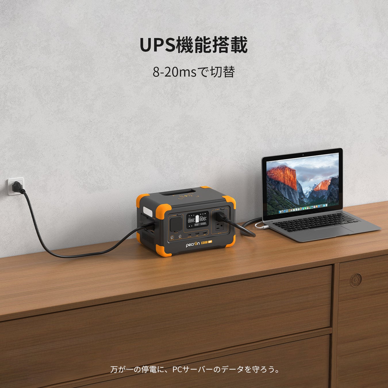 E300LFPはUPS(無停電電源装置)機能を搭載しており、停電などの商用電源の異常を検出した時は、8~20ms以内にポータブル電源E300LFPに切り替えて供給を継続します。