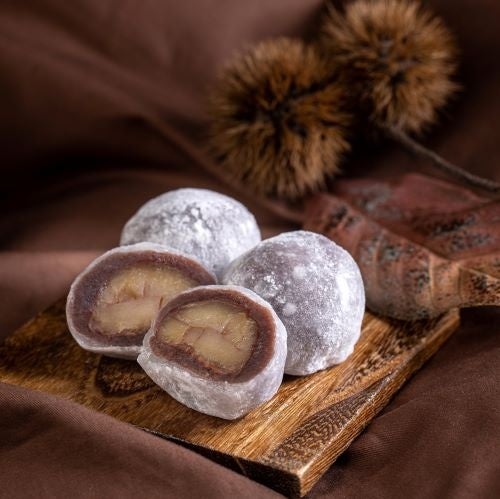 柔らかな羽二重餅にこし餡と渋皮栗をまるごと包み込みました。