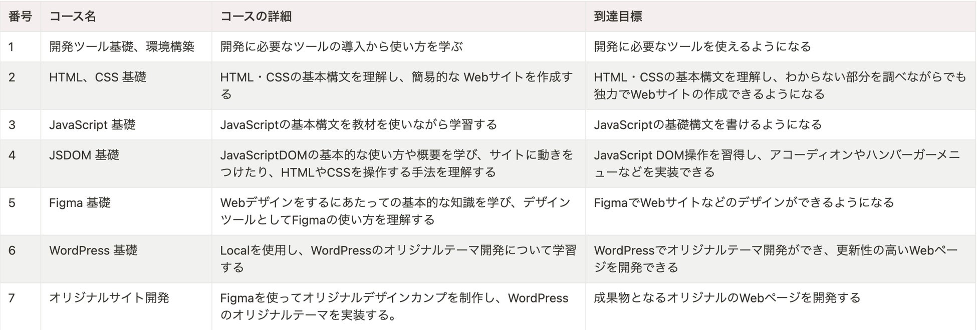 次に、JavaScriptを用いたDOM操作や、Figmaを使用したWebデザインの基礎を習得し、WordPressを使ったオリジナルテーマの開発に進みます。