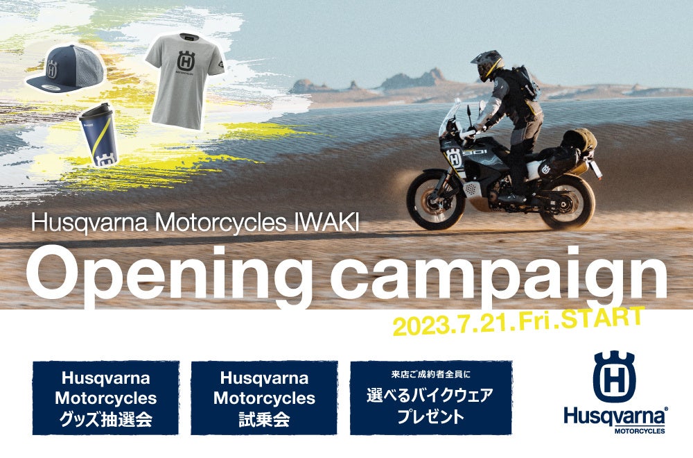 ・Husqvarna Motorcycles いわきへご来店いただき、ハスクバーナ・モーターサイクルズ車両のご成約をされた方が対象です。(中古、新車を問いません) ・他の販売キャンペーンとは併用できません。 ・お選びいただけるバイクウェアは上限2万円(税込)までの中から1点となります。 ・在庫状況により景品を予告なく変更する場合がございます。 ・景品のお渡しはご納車時となりますので、契約をキャンセルされた場合は本キャンペーンの権利も失効となります。  |