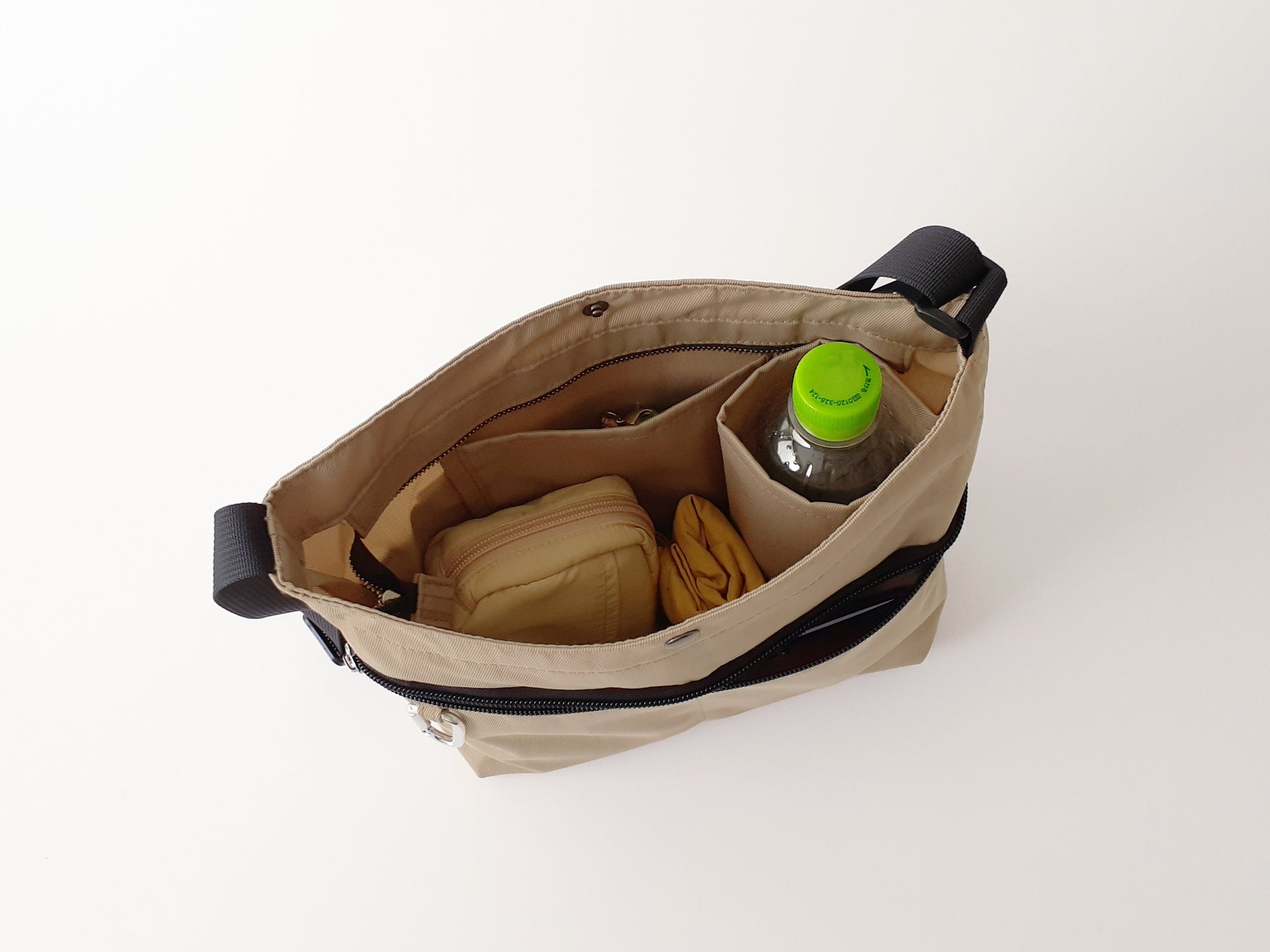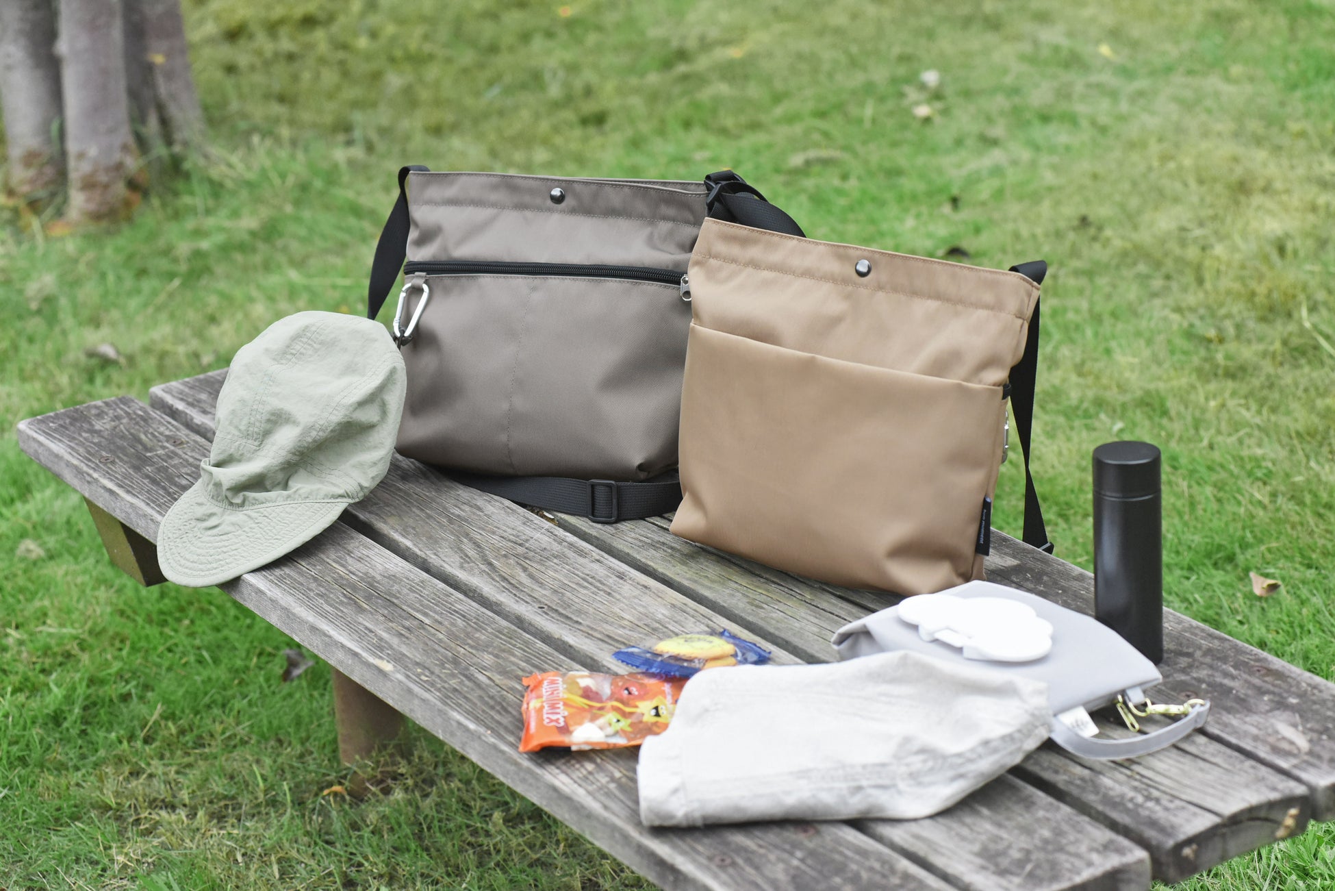ママバッグとしての機能と見た目にもこだわりました。公園遊び中も身軽に動けるコンパクトサイズながらも、A5サイズの本などもすっぽり入る、8cmほどの薄マチ仕立て。身に着けて持ち歩きたいグッズをしっかり収めながら最小限の大きさに抑えた、絶妙なサイズ感に設計しています。急に駆け出す子どもを追いかけるのも楽な、アクティブに動くのに負担にならない大きさです。