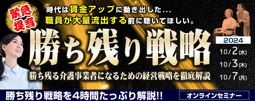 勝ち残る介護事業者になるための経営戦略を徹底解説。オンライン会場にて10月2日より3日程で順次開催。