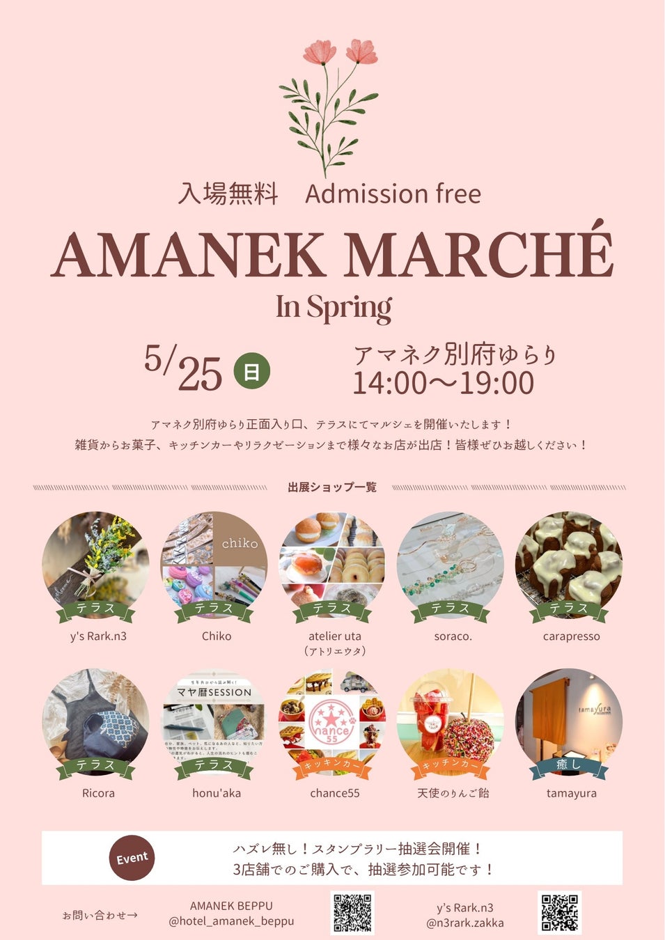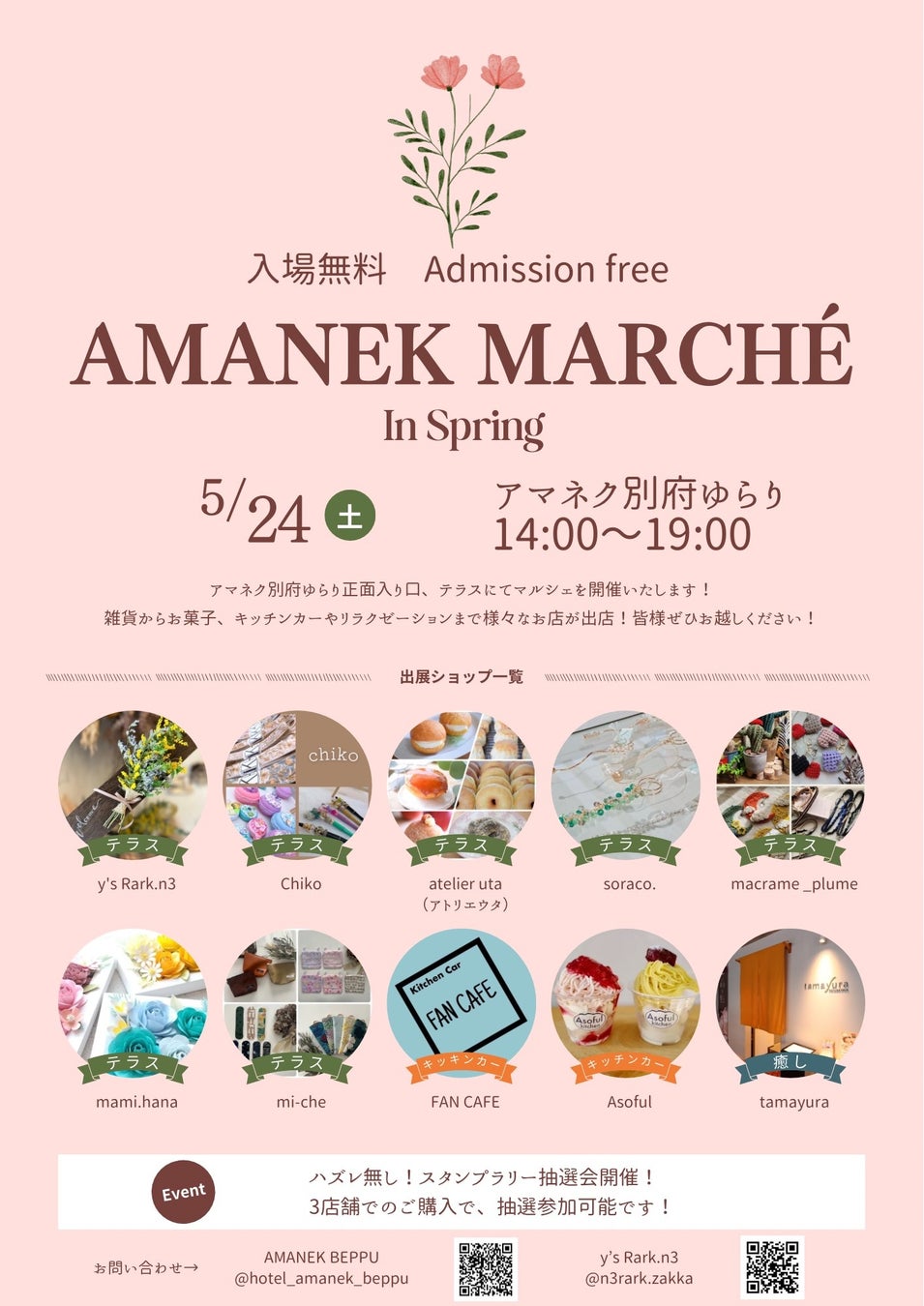 株式会社アマネク(東京都千代田区、代表取締役:安達禎文)が運営する「アマネク別府 ゆらり」(以下:アマネク別府)は、SNSでも人気の大分で活躍するハンドメイド作家やキッチンカーなどを一堂に集めた「アマネクマルシェ in Spring」を5月24日(土)・25日(日)の二日間限定で開催いたします。