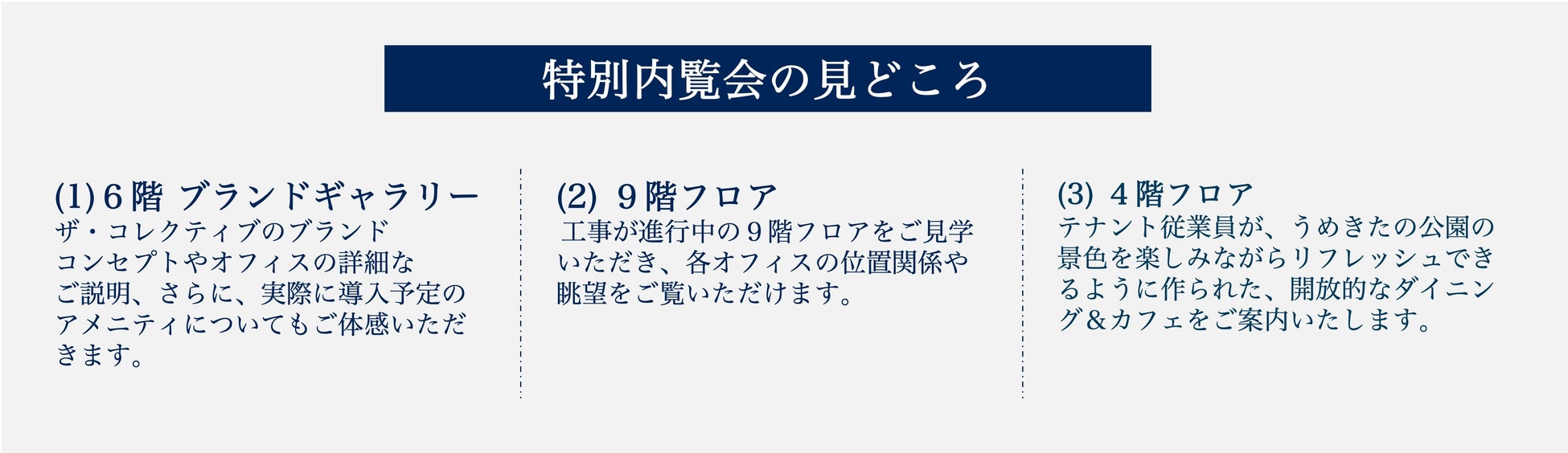 人気の窓側や使い勝手の良いサイズのお部屋は、オープン時にはその多くが契約で埋まってしまいます。オープン前にブランドコンセプトやアメニティをご体験いただきつつ、工事が進む現地にて実際のオフィスの位置関係や眺望をご覧いただける予約制の特別内覧会を実施中です。