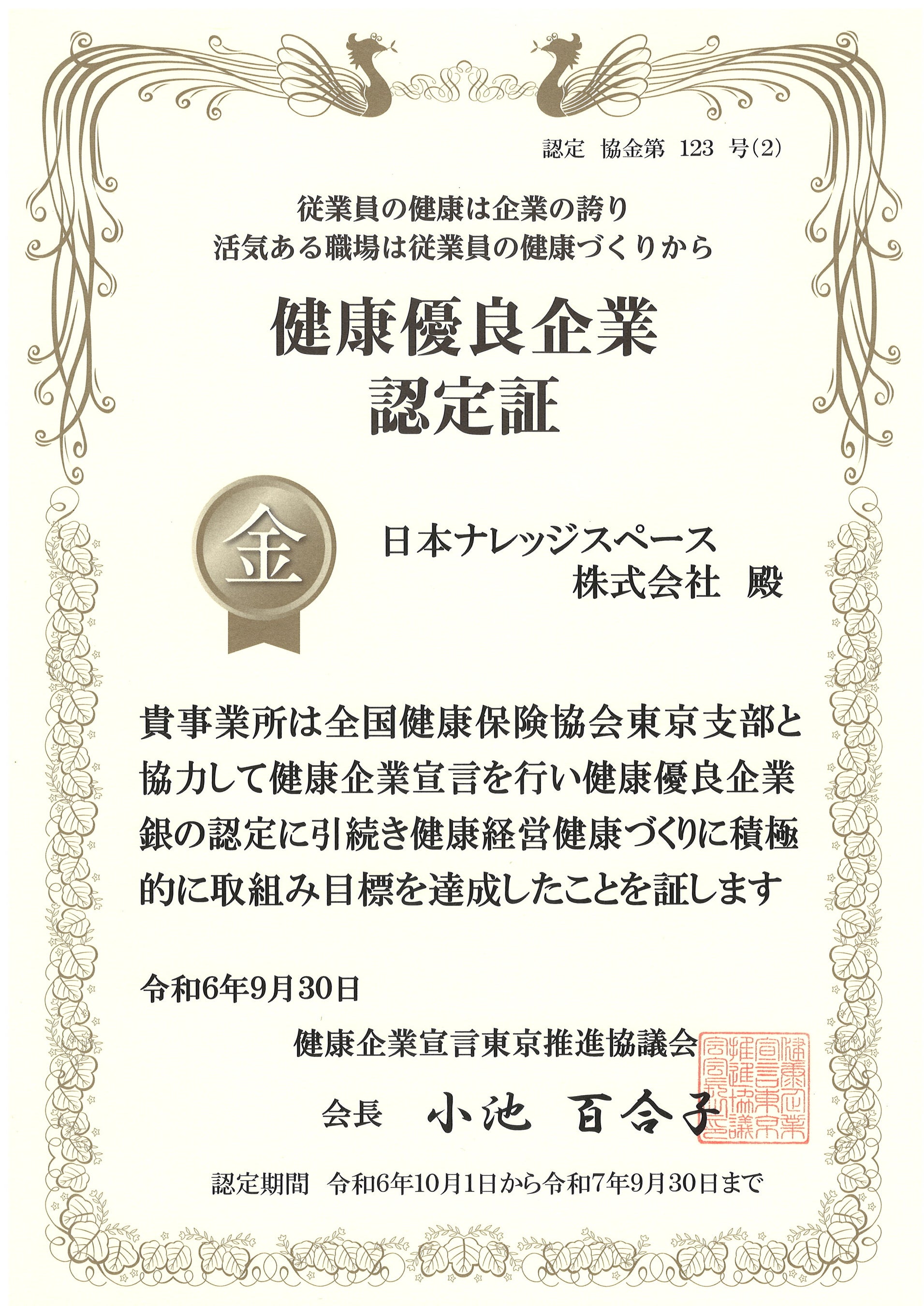 日本ナレッジスペース株式会社は全国健康保険協会東京支部より3年連続で「健康優良企業 金の認定」を頂きました。健康優良企業にはSTEP1「銀の認定」、STEP2「金の認定」があります。
