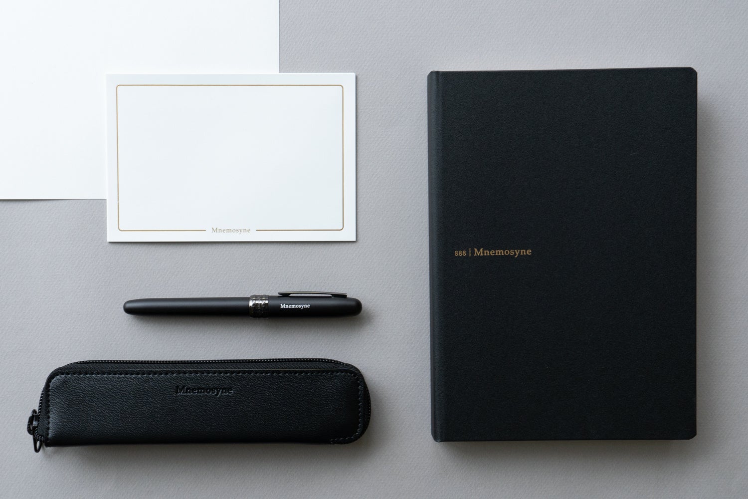 プラチナ万年筆の「PLAISIR」とマルマンの「ニーモシネ ジャーナル」の特別セット。「PLAISIR」は、堅牢でやわらか、ライトで本格的な万年筆です。セットに付属するPLAISIRは、ニーモシネカラーの黒を全体に施し、マットな質感に「Mnemosyne」のロゴを刻印した特別仕様です。他にも、ペントレーにもなる「万年筆ケース」、オリジナル箔付き「メッセージカード」、「吸取紙」がセットになっています。