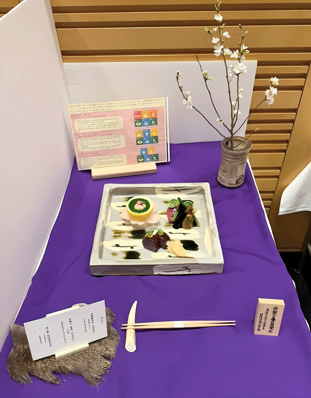 「郷土料理」「現代日本料理」「サステナブル~未来を考える日本料理~」の3部門のうち、竹松が作品を出展した「サステナブル~未来を考える日本料理~」部門では、食材の産地、環境負荷を極力抑えて栽培した野菜、肉、魚介類等、SDGs全17項目のいずれかを考慮した日本料理の展示を行いました。