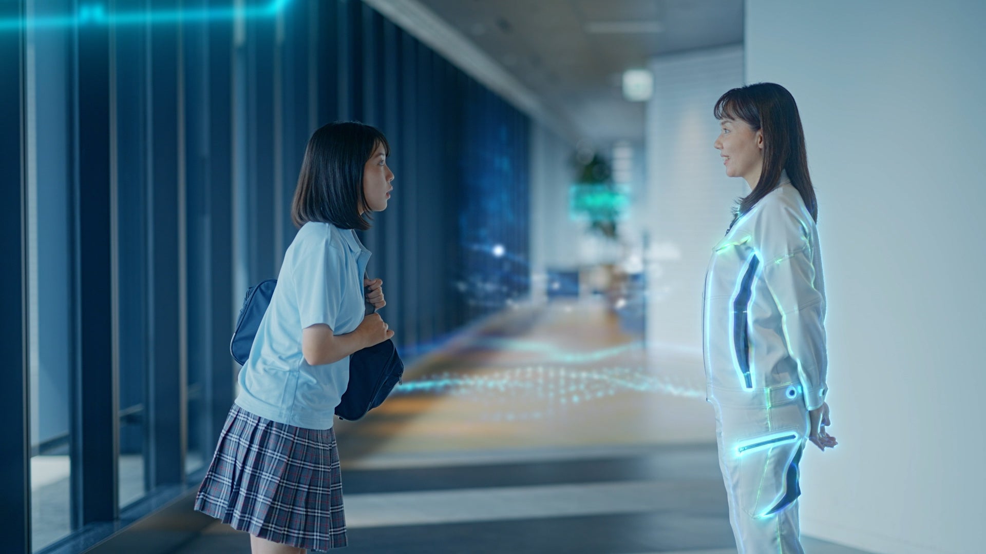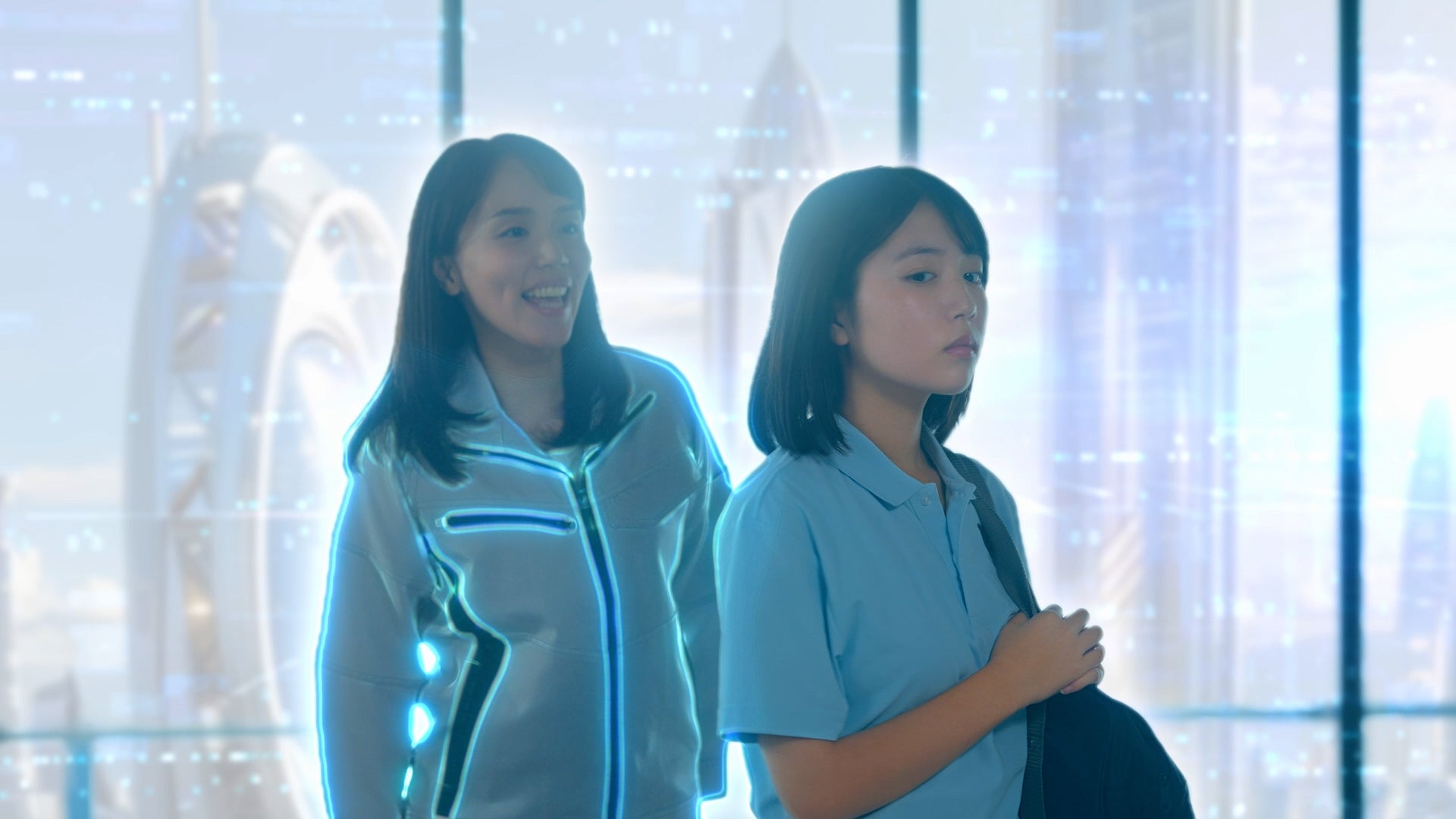 何気なく窓の外を眺めながら「未来」について考える15歳の少女。突然、そばにあった壁面ビジョンに映る“女性”に声を掛けられ、画面に映る2050年の世界に引き込まれます。なんとその“女性”は、建設業で働く“未来の自分”だったのです。