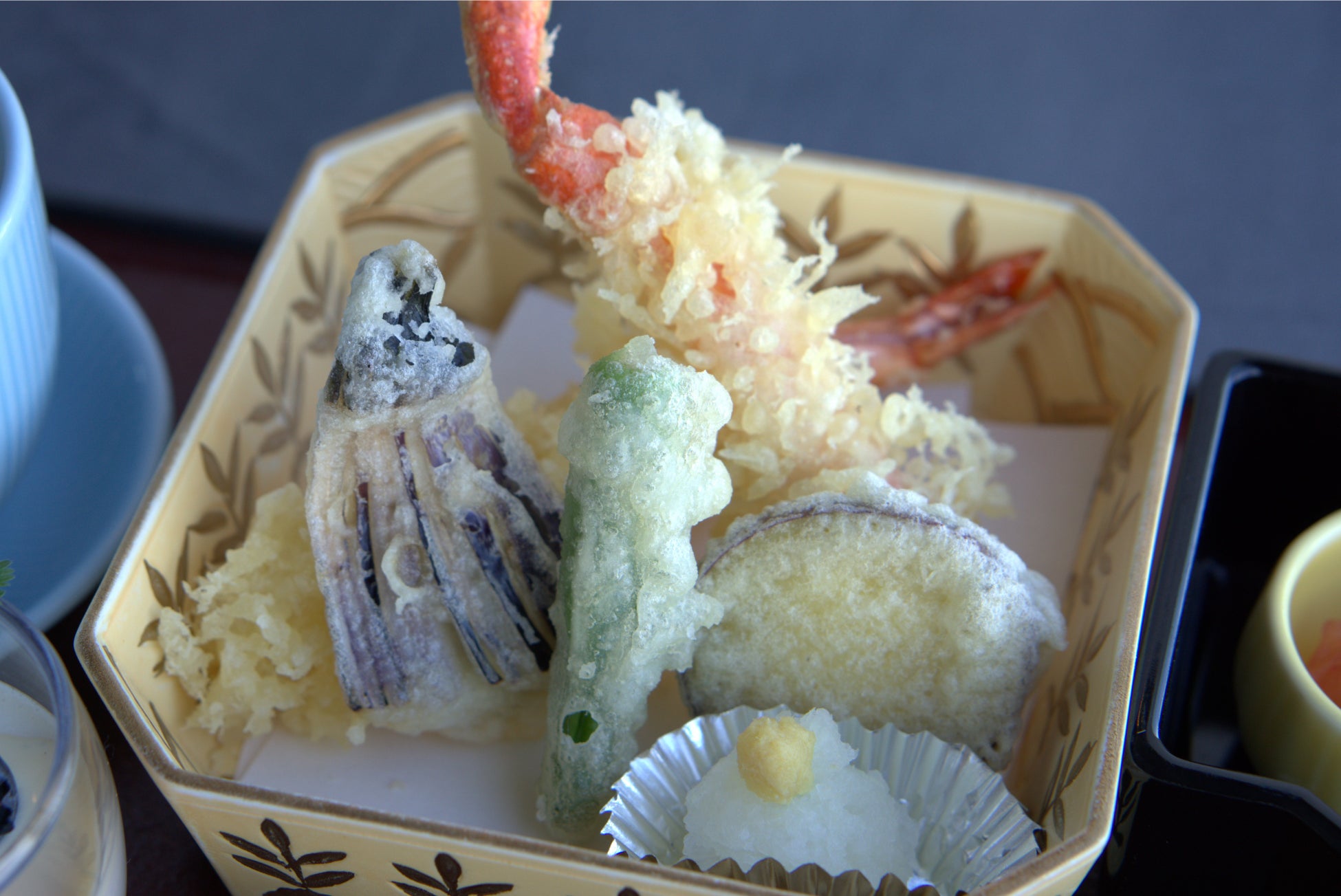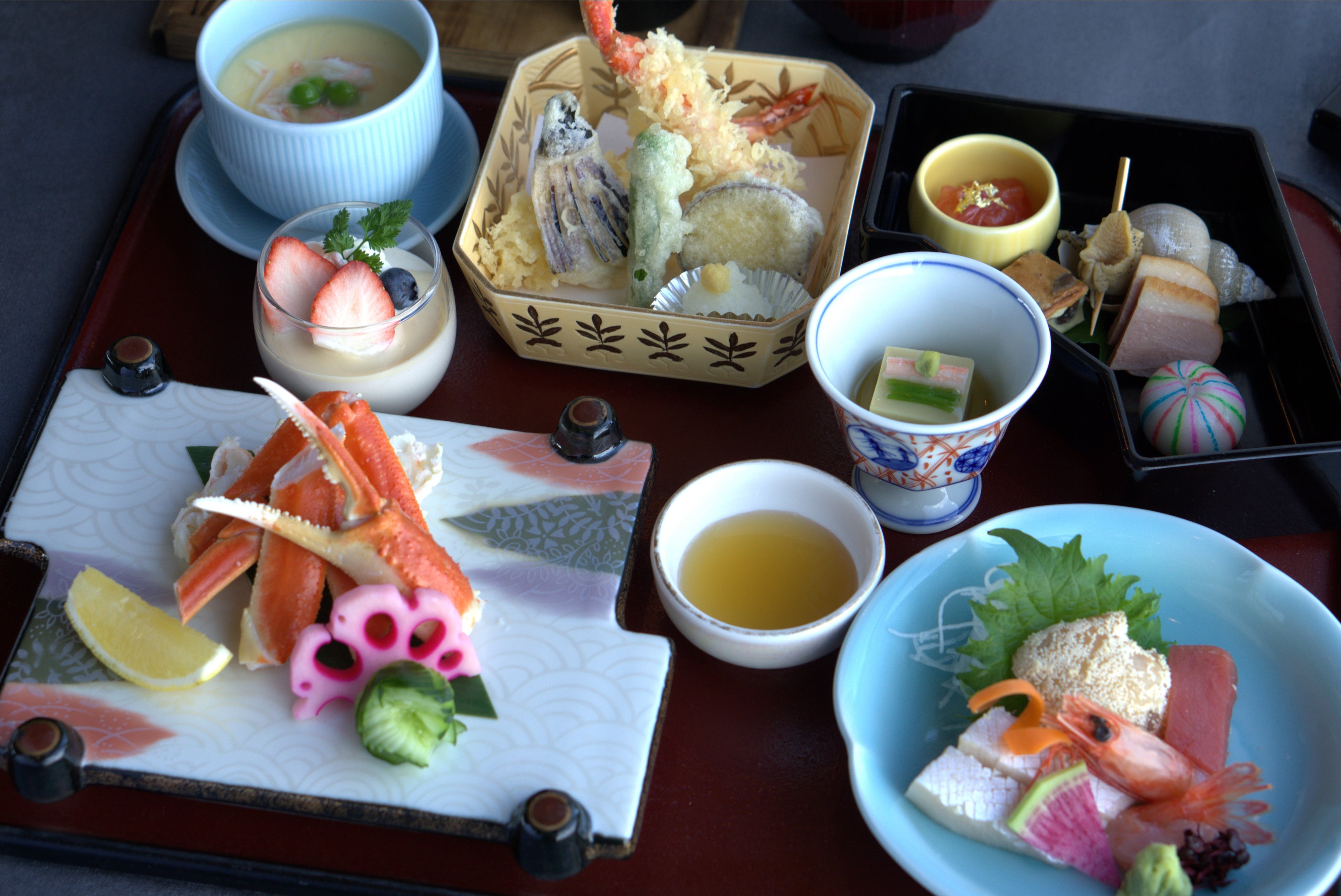 - 揚げ物:海老・ずわい蟹の天婦羅、季節野菜の天婦羅3種