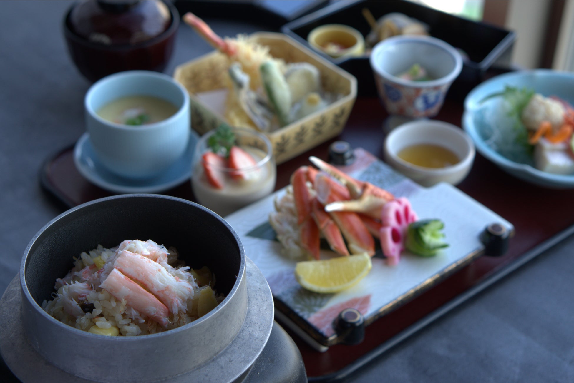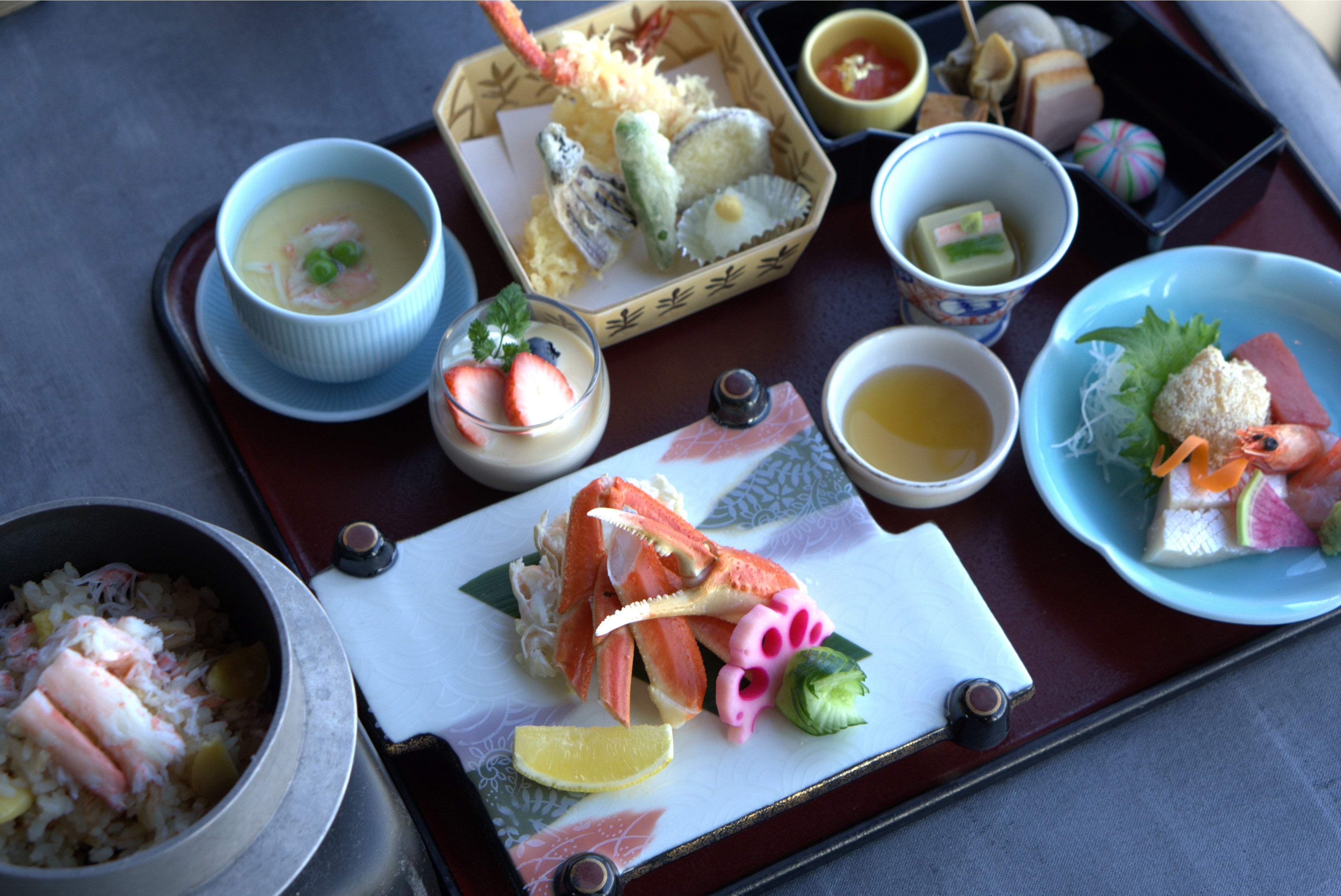 蟹味噌豆腐に、茶碗蒸し、酢の物、天ぷら、〆は釜めし。ずわい蟹を味わい尽くす豪華蟹御膳で旅をランクアップ!