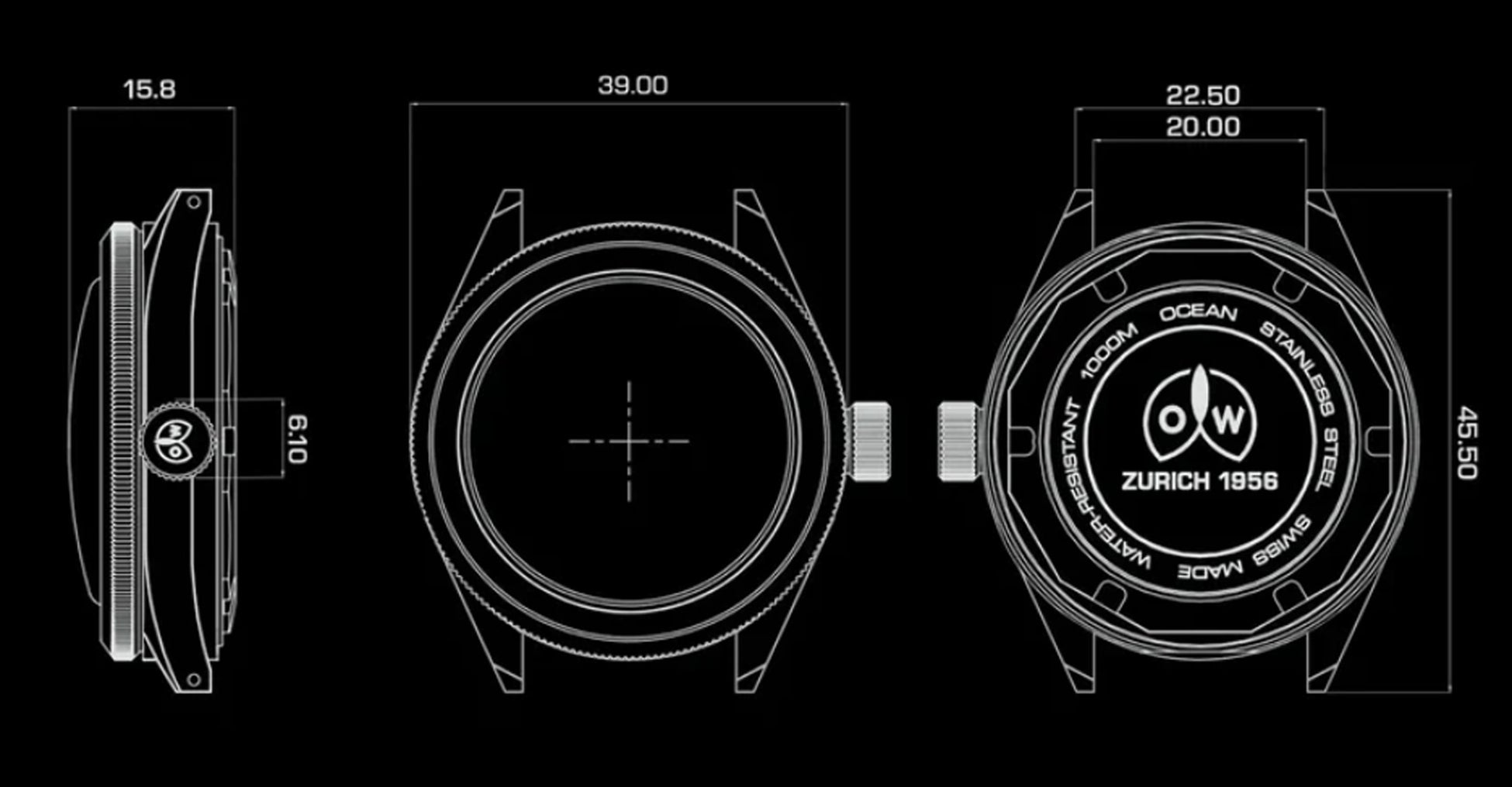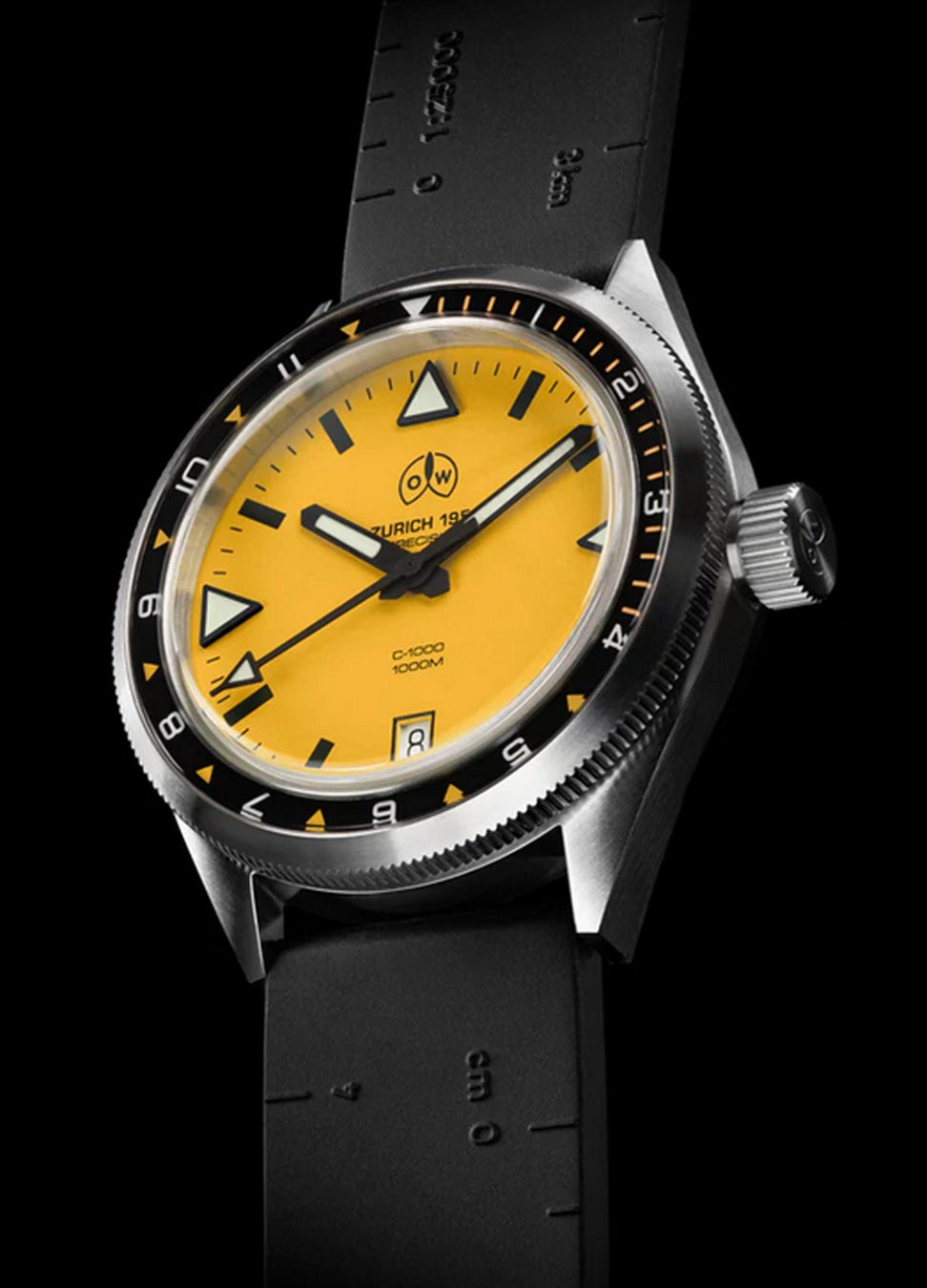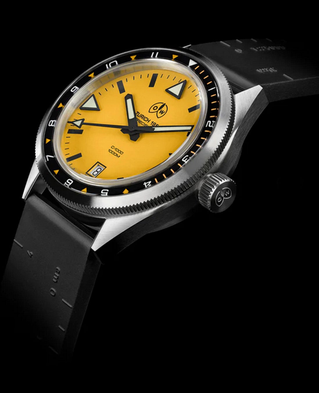 オレッヒ&ワイス(以下OW)の『C1000Y』は1964年に世界初の1000m防水を達成し公式記録を塗り替えた「カリビアン1000」へのオマージュとして、その象徴的なモデルである「C1000」シリーズのラインナップに加わりました。『C1000Y』は『C1000A』『C1000MkII』にはない大胆なカラーとしてイエローを採用。イエローダイヤル自体は1960年代から登場し、多くの先駆者達から厚い信頼を得てきた機能由来のカラーですが、伝説の「カリビアン1000」への現代的な再解釈として登場することで「C1000」ならではのストイックな斬新さが際立ちます。スペックは、その出現以降ダイバーズウォッチの新たな規範となったと言われる尖った形のラグを特徴とする702ブロックケース独自のモディファイを加えたカスタム仕様のSoprod Newton Precision P902 自動巻ムーブメントを搭載。またベルトにはSSメッシュブレスレット、ナイロンRAFストラップ、ラバーストラップなど様々なシーンに対応可能な品揃えになっております。