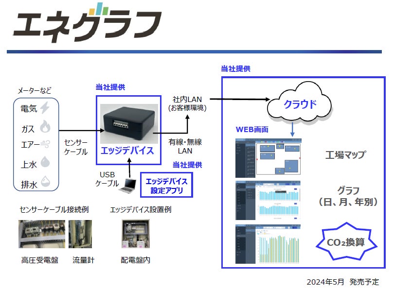「エネグラフ」は、電気やガス、エアー、水などを利用する生産設備から使用量データ収集し、クラウドでエネルギー使用量をリアルタイムに分析することができます。