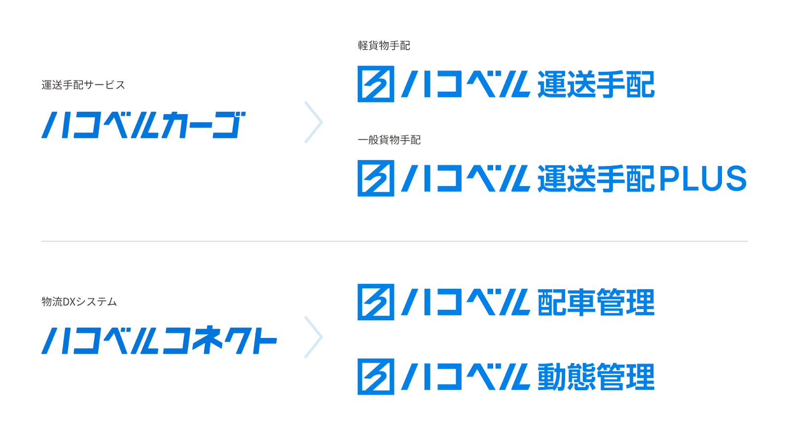 運送手配サービス領域において、軽貨物手配サービスを「ハコベル運送手配」、一般貨物手配サービスを「ハコベル運送手配PLUS」と名称変更いたします。また、物流DXシステム領域において、これまで「ハコベルコネクト」として提供してきたサービスを「ハコベル配車管理」「ハコベル動態管理」など機能別に名称を分けて、ニーズにお応えしてまいります。
