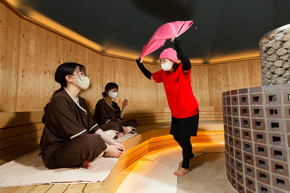 岩盤浴エリアにある「ロウリュウサウナ」では、大人気のロウリュウイベントを毎日開催しています。
