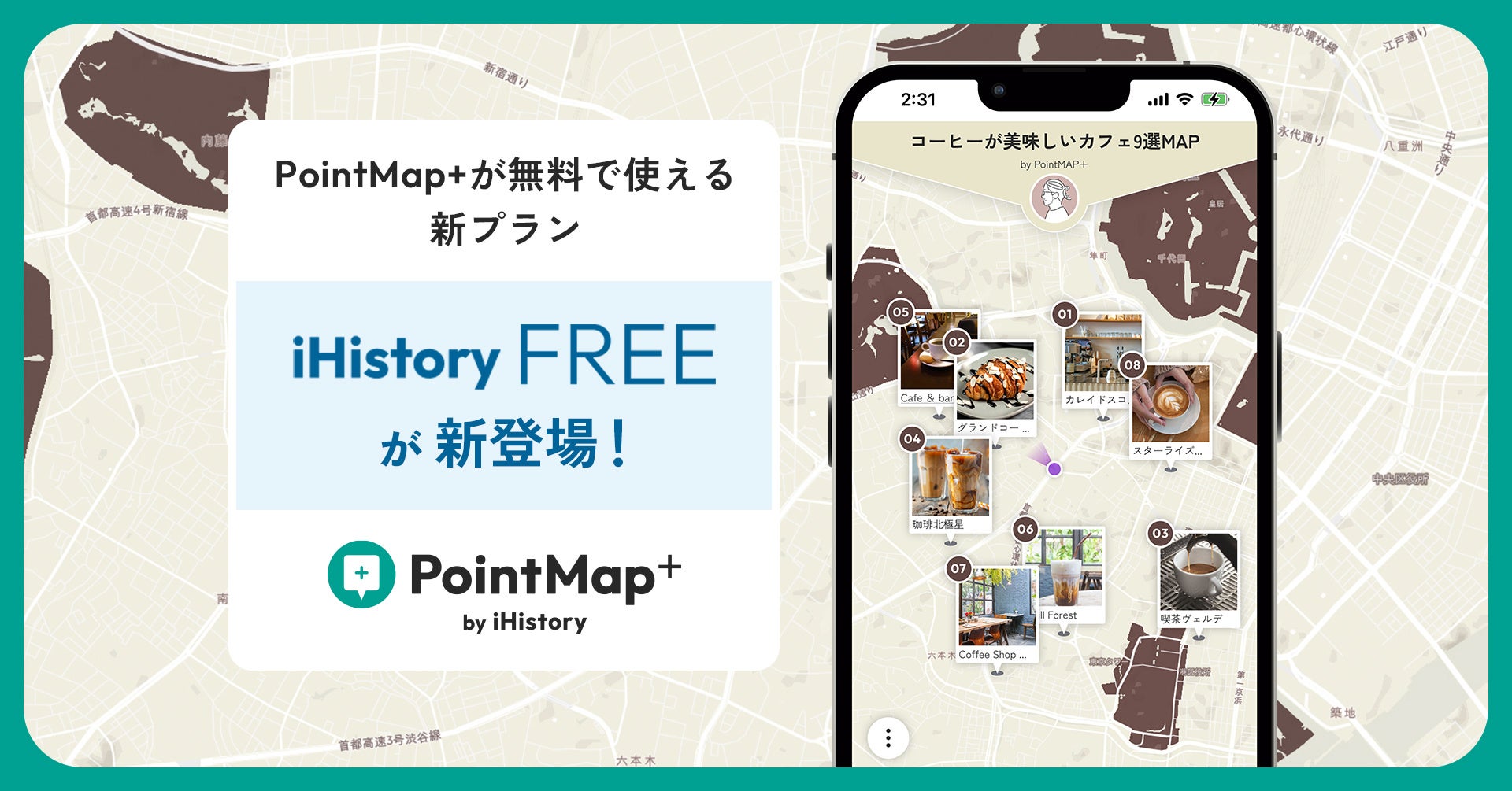 スタートアップの株式会社iHistory(本社:東京都港区、CEO:中野一誠、以下、iHistory Inc.)は、誰でも簡単にオリジナルのデジタルマップが作成できる新しいWebサービス「PointMap+(ポイントマッププラス)」に、無料で利用できる新プラン『iHistory FREE』を追加し、2025年4月14日(月)より提供開始しました。