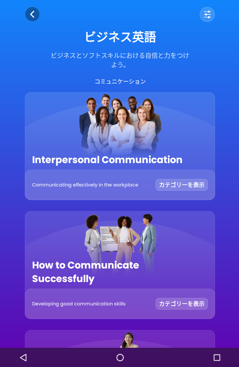 「Collaboration」「Critical Thinking」などのソフトスキルを英語で学習。動画とクイズの反復で、重要語彙・表現を理解しながら、職場で応用できる知識が習得できます。