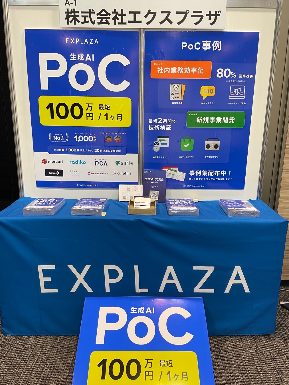 弊社ブースでは、「EXPLAZA 生成AI Partner」や「ハタアゲ PoC」についてご紹介し、実際のプロジェクト事例のご紹介や各社様に合った進め方のご提案を実施いたしました。