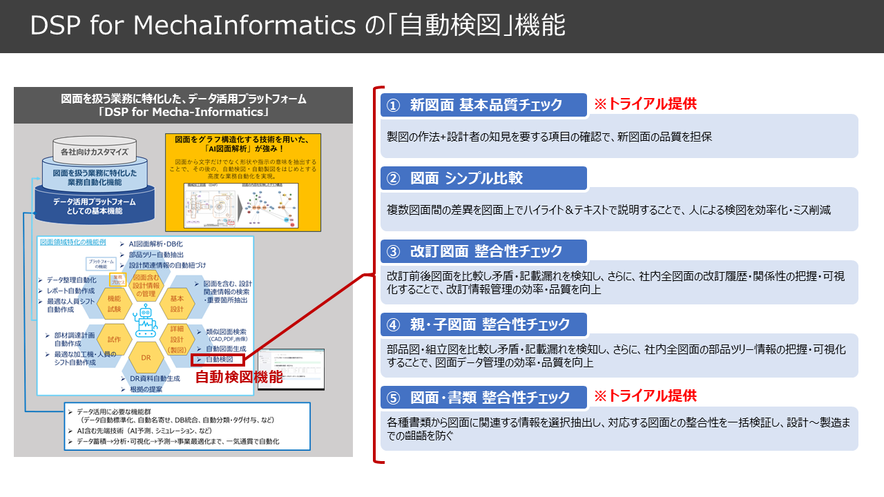 独自技術で設計意図を理解し、非クラウド環境で実務レベルの検図を実現する「自動検図」機能の無償トライアルを開始~図面関連業務特化のデータ活用基盤「DSP for MechaInformatics」