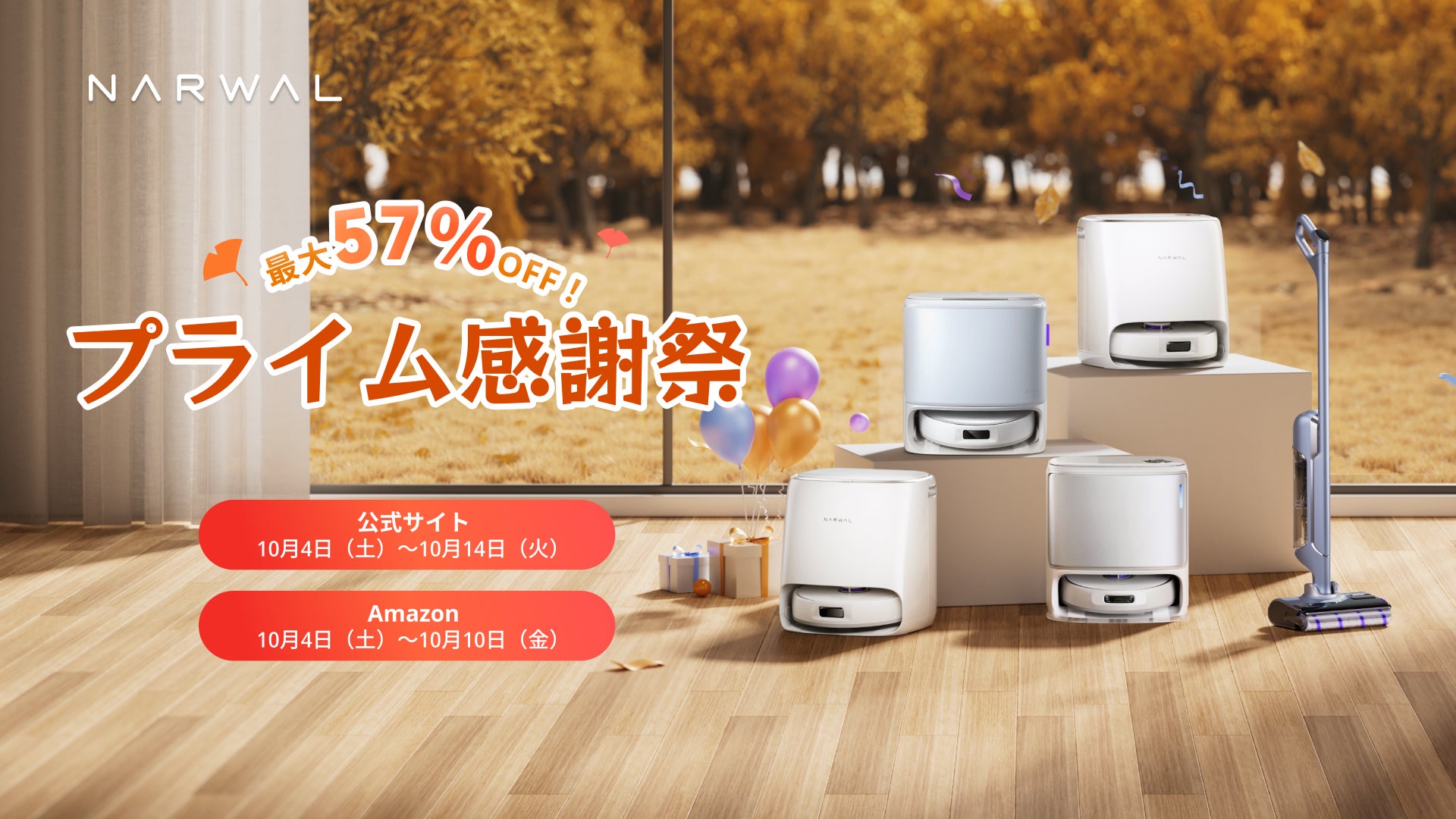 Narwal Japan株式会社(東京都中央区)は、2025年10月4日(土)からの秋のプライム感謝祭に合わせて、同社の人気製品を対象とした特別セールを開催いたします。