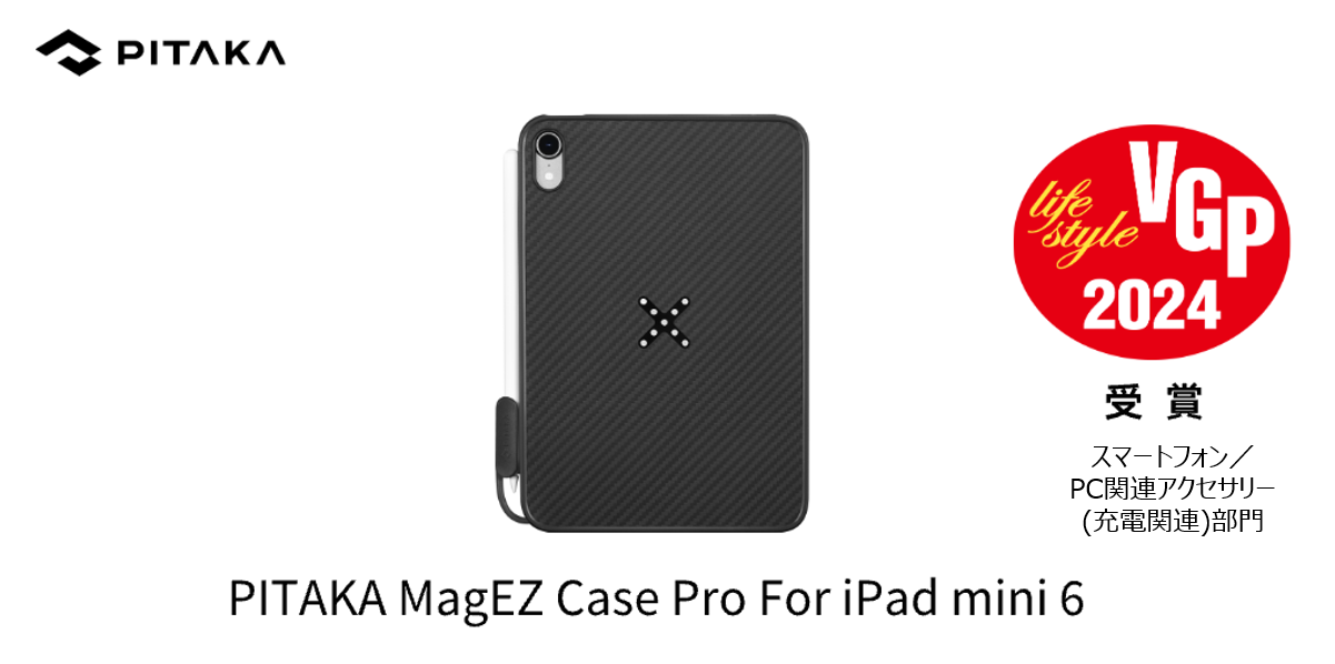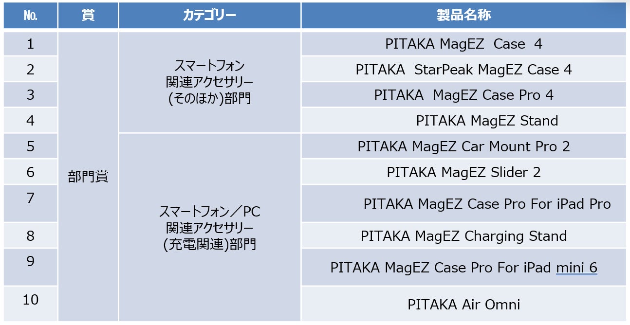 受賞製品の内訳は、 「スマートフォン関連アクセサリー(そのほか)部門」にて「PITAKA MagEZ Case 4」、「PITAKA StarPeak MagEZ Case 4」、「PITAKA MagEZ Case Pro 4」、「PITAKA MagEZ Stand」の4製品、そして 「スマートフォン関連アクセサリー(充電関連)部門」にて「PITAKA MagEZ Car Mount Pro 2」、「PITAKA MagEZ Slider2」、「PITAKA Air Omni」、「PITAKA MagEZ Case Pro For iPad Pro」、「PITAKA MagEZ Case Pro For iPad mini 6」、「PITAKA MagEZ Charging Stand」の6製品となります。