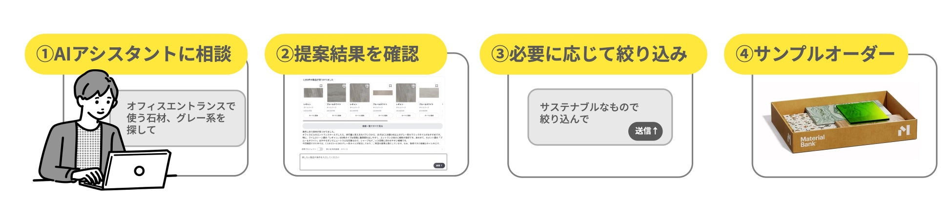 使い方は簡単。会話するように自分の探しているマテリアルの要望を伝えていくだけで、すぐに最適な提案を受けられます。