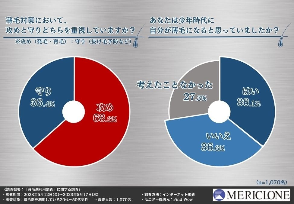 「薄毛対策において、攻め(発毛・育毛)と守り(抜け毛予防など)どちらを重視していますか?(近い方をお答えください)」と質問したところ、6割以上の方が『攻め(63.6%)』と回答しました。