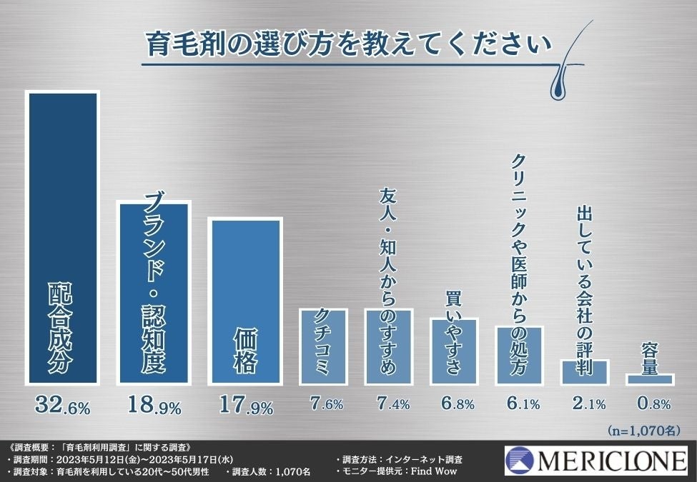 そこで「育毛剤の選び方を教えてください」と質問したところ、『配合成分(32.6%)』と回答した方が最も多く、次いで『ブランド・認知度(18.9%)』『価格(17.9%)』『クチコミ(7.6%)』と続きました。