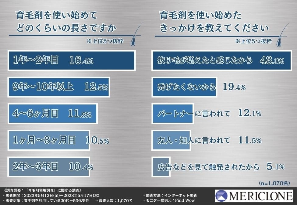 そこで育毛剤の老舗メーカーとして、挑戦する男の育毛剤『Upride(ユープライド)』(https://upride.jp/)を製造・販売する株式会社河野メリクロン(本社:徳島県美馬市、代表取締役:河野 圭佑)は、育毛剤を利用している20代~50代の男性1,070名を対象に、「育毛剤利用」に関する調査を実施致しました。
