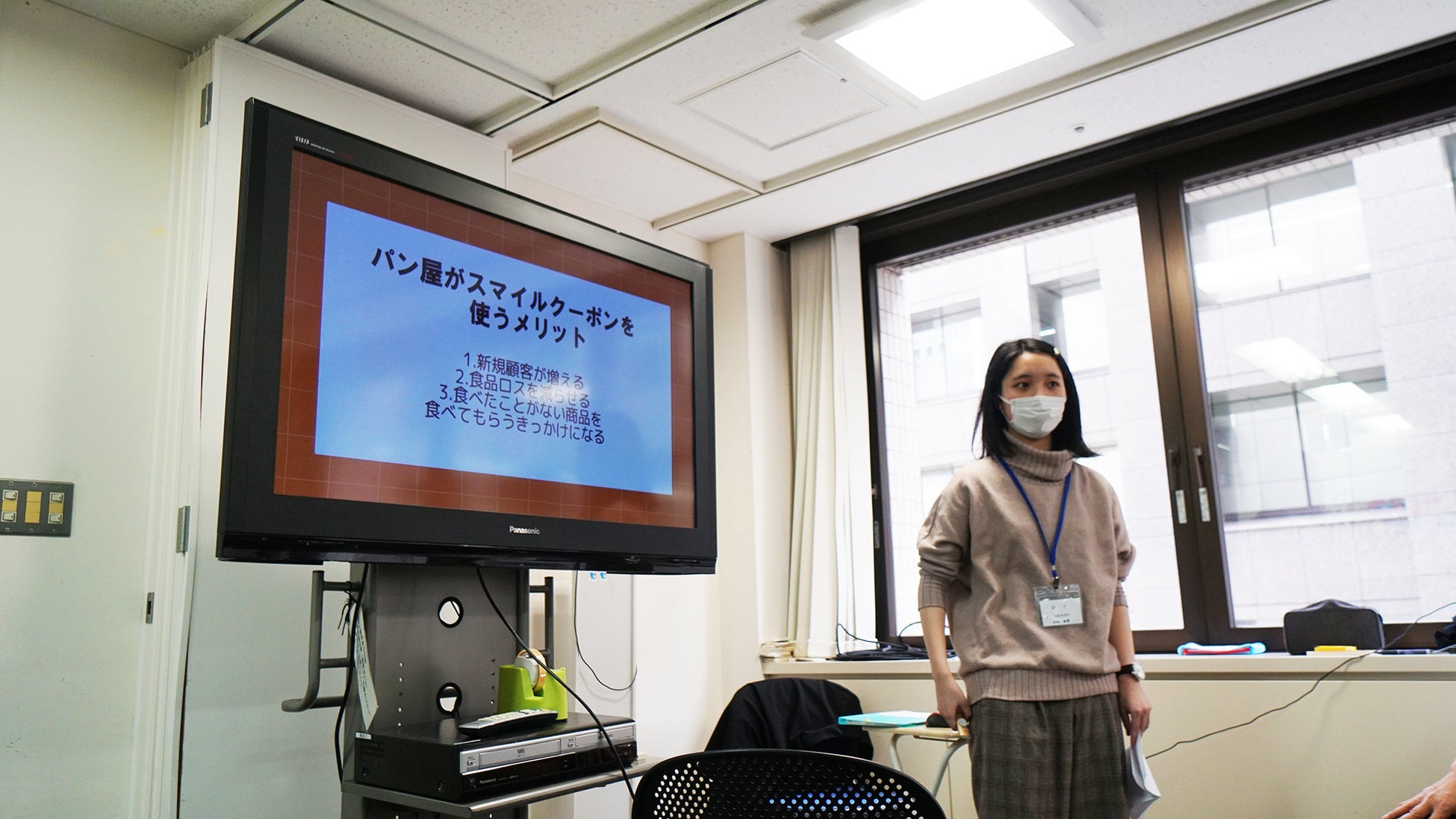 イートインスペースを構えるパン屋をターゲットに、「新規顧客の増加」、「廃棄商品の削減」、「たくさんの商品を手に取ってもらうきっかけ作り」などを企図して、ミニサイズの複数商品をつめあわせた「おためしセット」と交換できるクーポンのアイデアを発表しました。