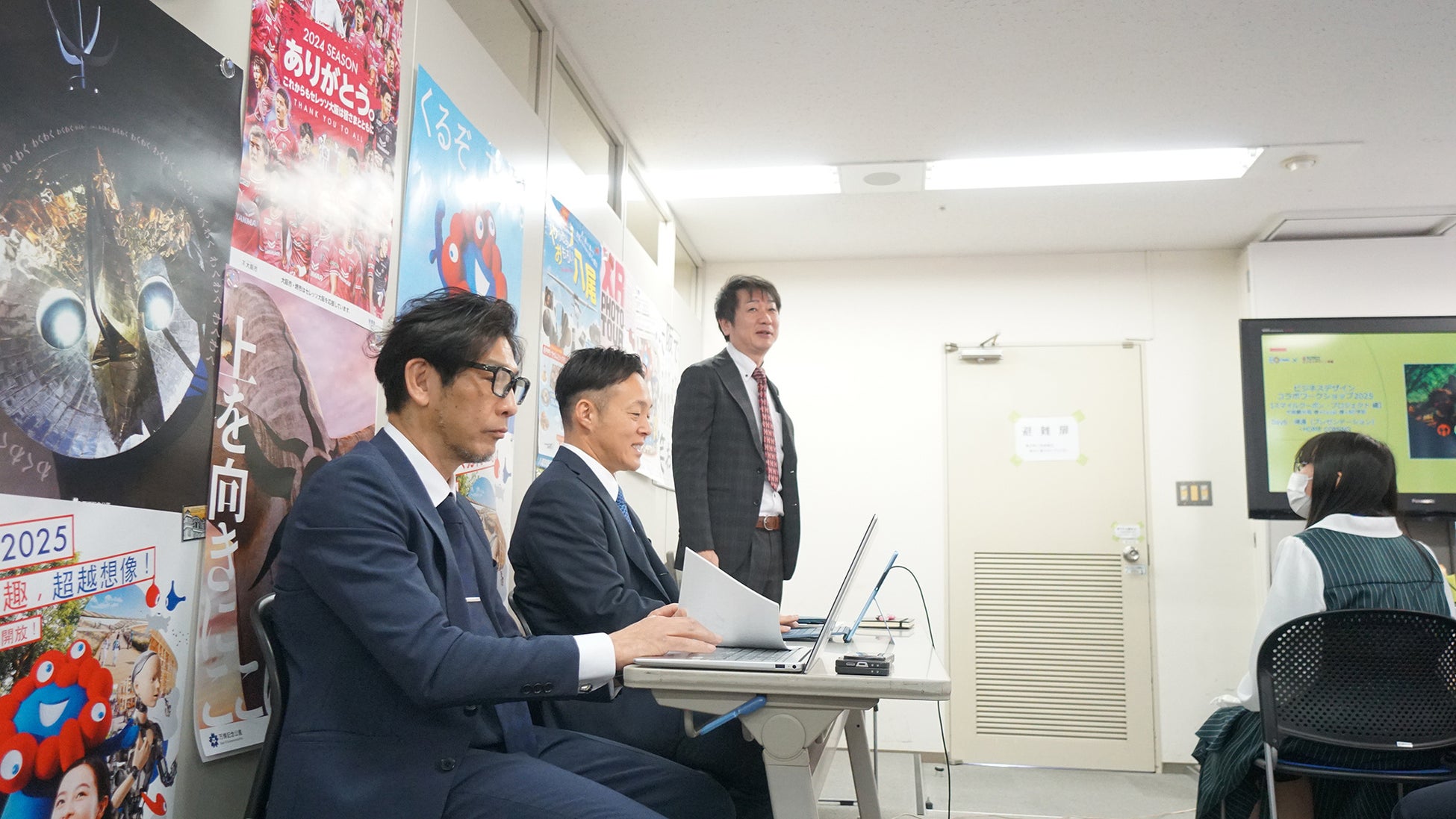 発表会の後に行われた記者会見では、開催間近となった大阪・関西万博を見据え、「Smile Coupon」事業紹介のほか、大阪・関西万博での掲出などについての発表が行われ、優秀賞を受賞した1班の学生たちも参加しました。