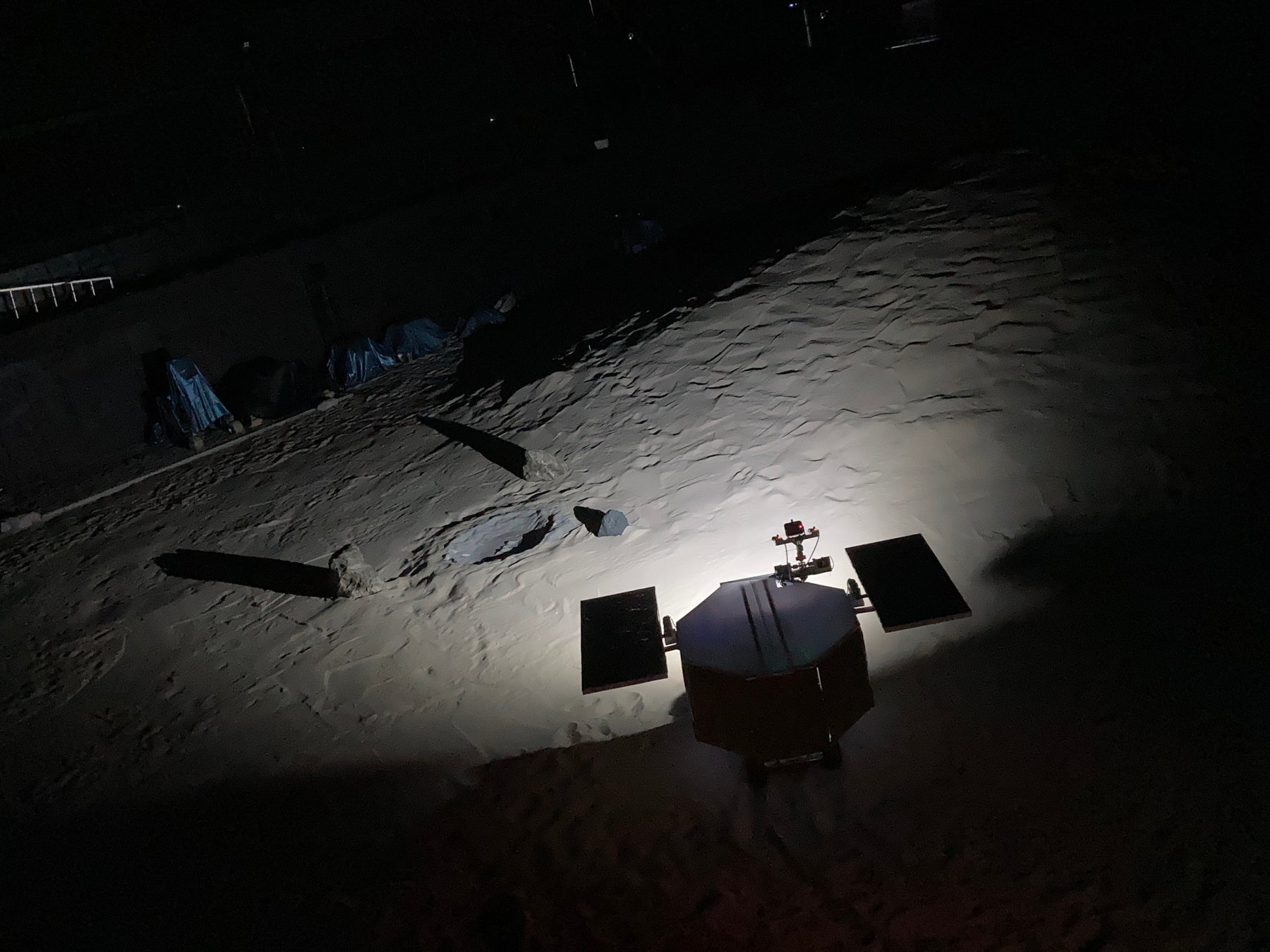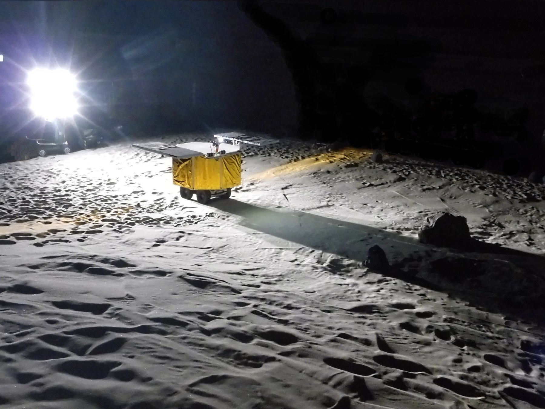 JAXA宇宙探査実験棟の宇宙探査フィールドの模擬月面環境で模擬ローバを使用した実証実験を行っています。月極域を想定し、永久影や横から差し込む太陽光を模擬した照明環境で、障害物検知と3D地図作成機能の性能、精度を検証し、性能改善を進めています。※5