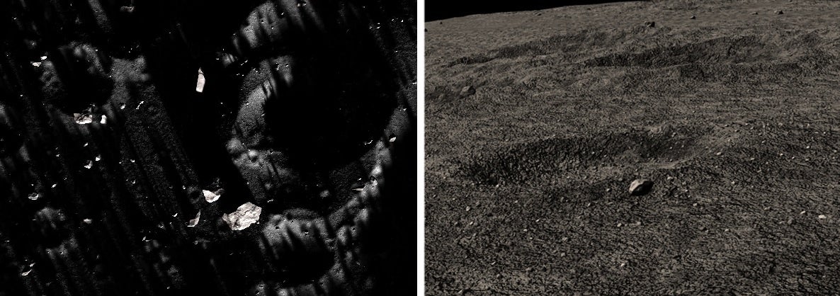 私達は、月面を想定した周囲環境認識技術の研究開発のため、NASAの観測データ※3に基づく月面地形のモデリング、月面探査機の実撮影画像を参考にしたテクスチャの再現、NASAのSPICE(Spacecraft Planet Instrument C-matrix Events)組み込みによる太陽光の模擬※4等、ゲーム開発エンジンUnityを用いて仮想環境モデルのリアリティを向上して来ました。