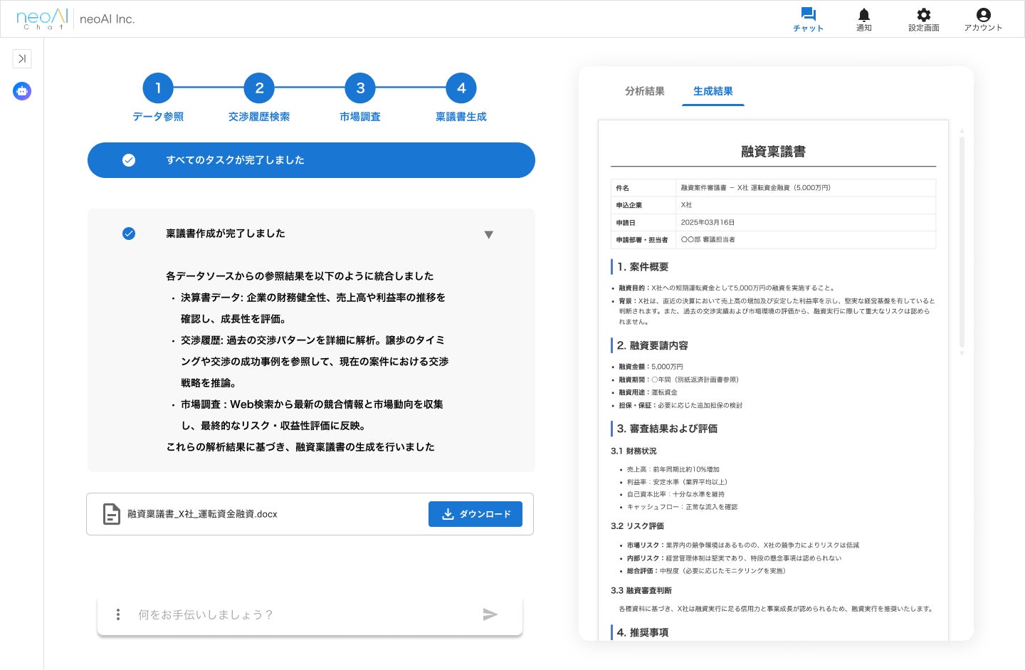 株式会社neoAI、金融機関向け融資稟議作成AI『neoAI Agent for 融資稟議』 ─決算データ・応対履歴等のデータを活用した、融資稟議作成を実現