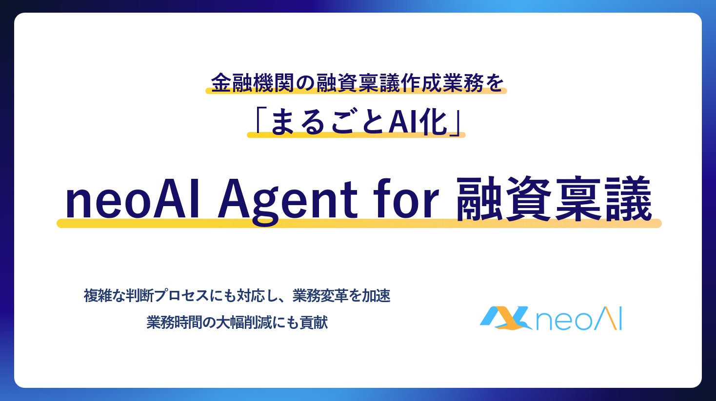 株式会社neoAIは、銀行をはじめとした金融機関向けに、融資業務効率と事業分析の精度を大幅に向上させるサービス「neoAI Agent for 融資稟議」の提供を開始いたしました。