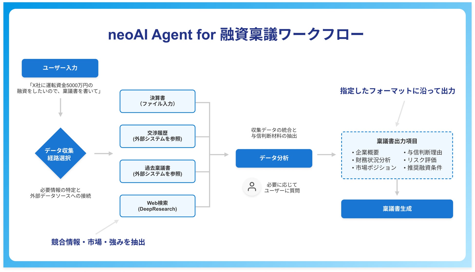複数の情報源(決算データ、交渉履歴、融資マニュアル等)からデータを自動集約し、高品質な稟議書を自動生成