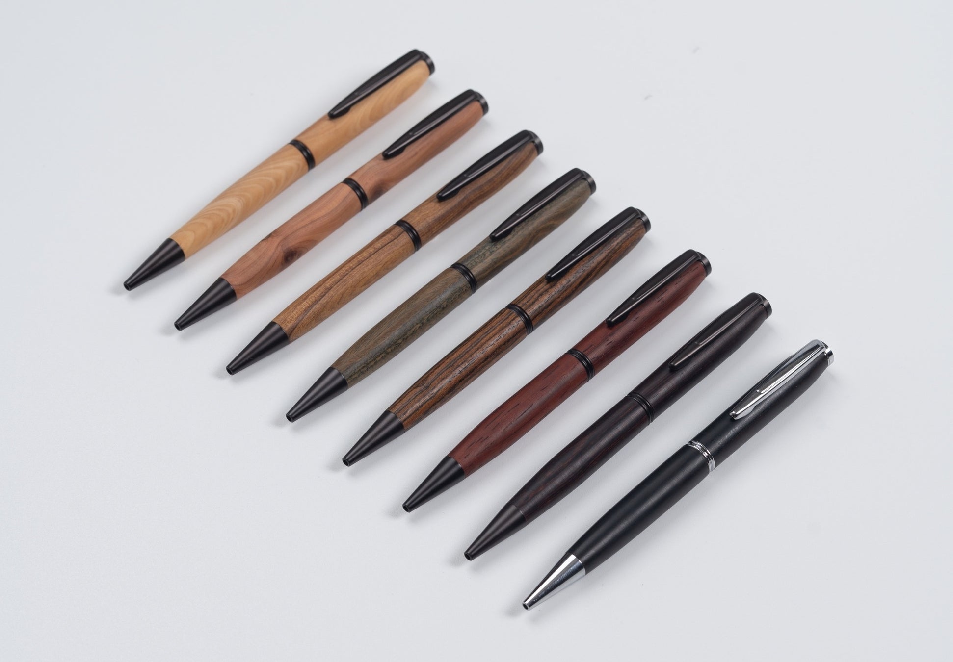 ウィスパーボールペンは、厳選された最高級の木材種を使用して製作されています。ペンの外観は豊かで深みのある色合いと独特の木目が美しく、ステインオイルを殆ど使わないため、豊かな木の香りが特徴的です。