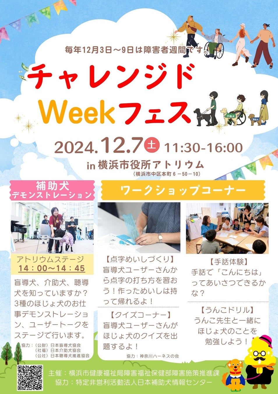 特定非営利活動法人日本補助犬情報センター(神奈川県横浜市、理事長:吉田文)は、横浜市の障害者週間イベント、チャレンジドWeekフェス2024にて、補助犬デモンストレーションステージ、ワークショップを出展します。